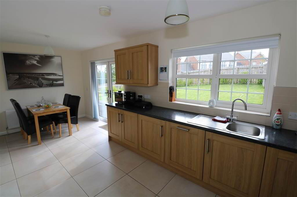 Patio doors, range of high and low level units, formica work surfaces, intergrated fridge freezer, five ring hob and oven, intergrated dishwasher, part tiled walls, ceramic tile flooring - W/C