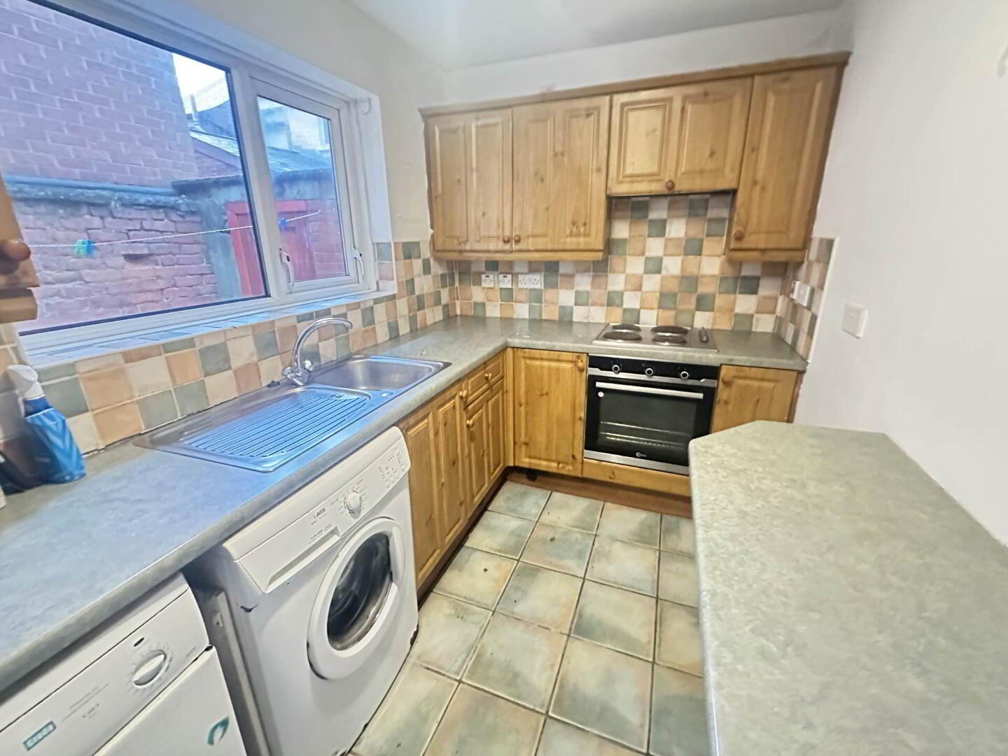 Range of high and low level units, formica work surfaces, breakfast bar, stainless steel sink drainer, intergrated hob and oven, plumb for washing machine, part tile walls, ceramic tiled flooring.