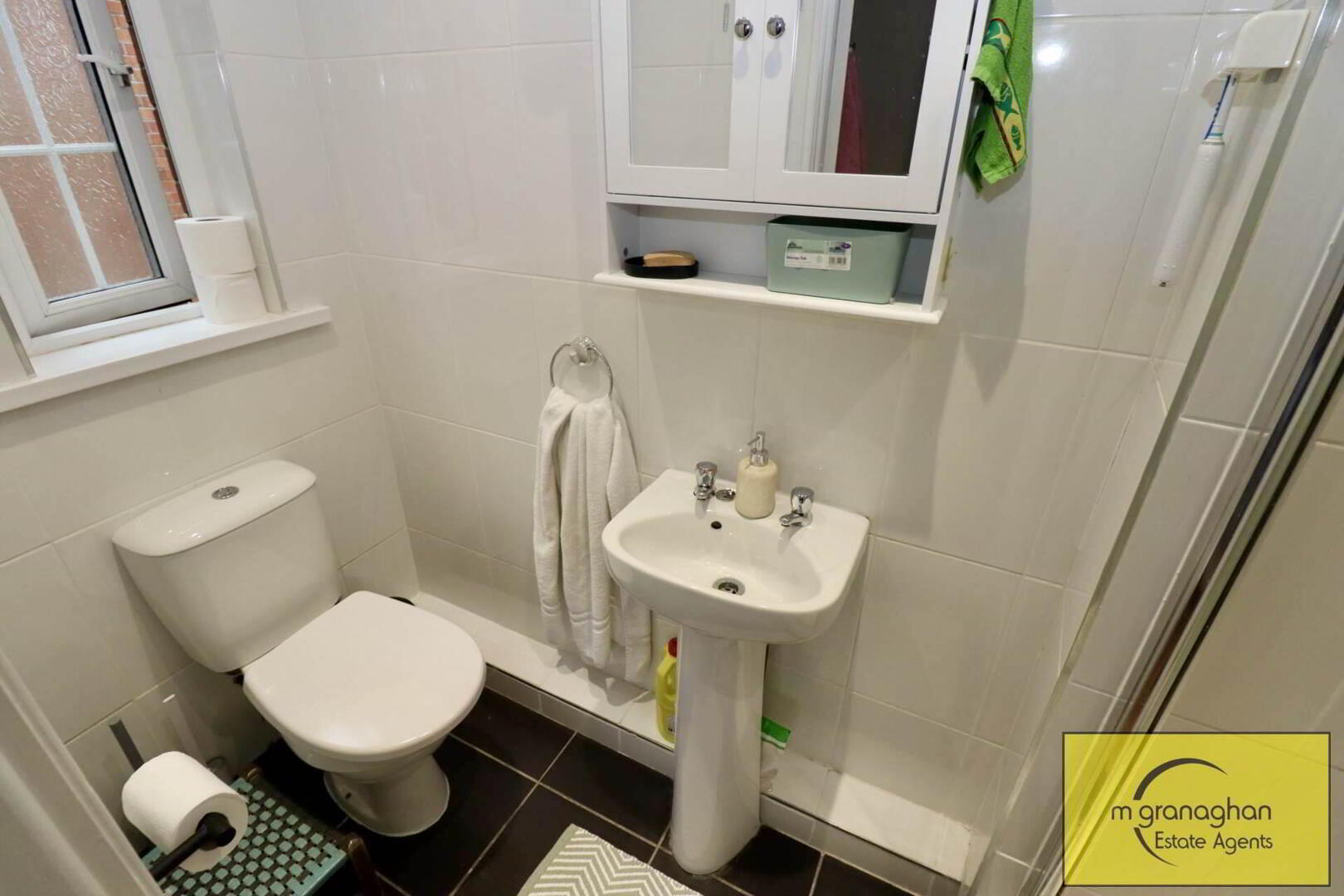 White suite comprising of Shower cubicle, pedestal wash hand basin, low flush WC, ceiling spots
