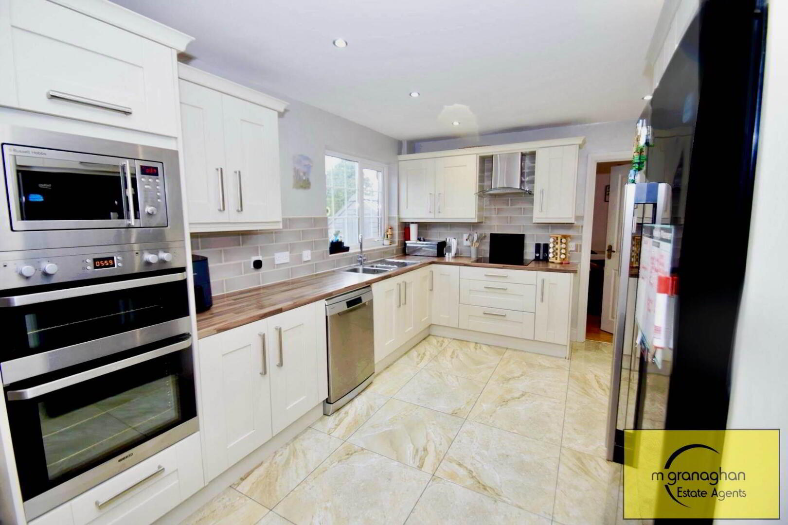 Modern fitted kitchen with a range of high and low level units, formica work surfaces, integrated double oven, integrated microwave, four ring ceramic hob with overhead extractor fan, space for dishwasher, space for Amercian fridge, ceramic tiled floor, and part tiled walls. Leads to dining area with double PVC doors to rear garden.