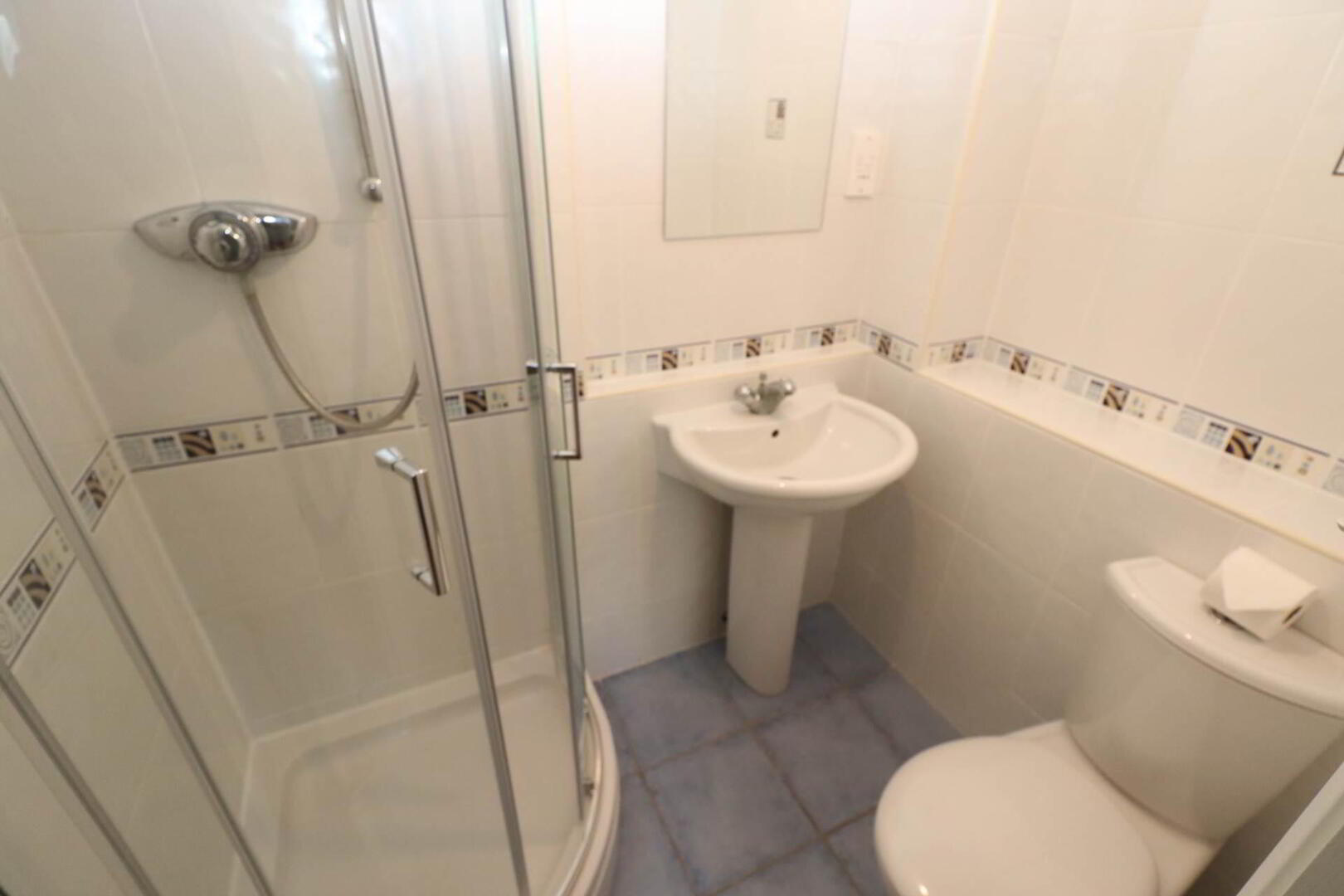 White suite comprising of shower cubicle, pedestal wash hand basin, low flush WC, ceramic floor and wall tiles