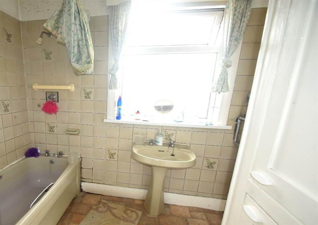 - Panel bath, pedestal wash hand basin, ceramic wall tiles