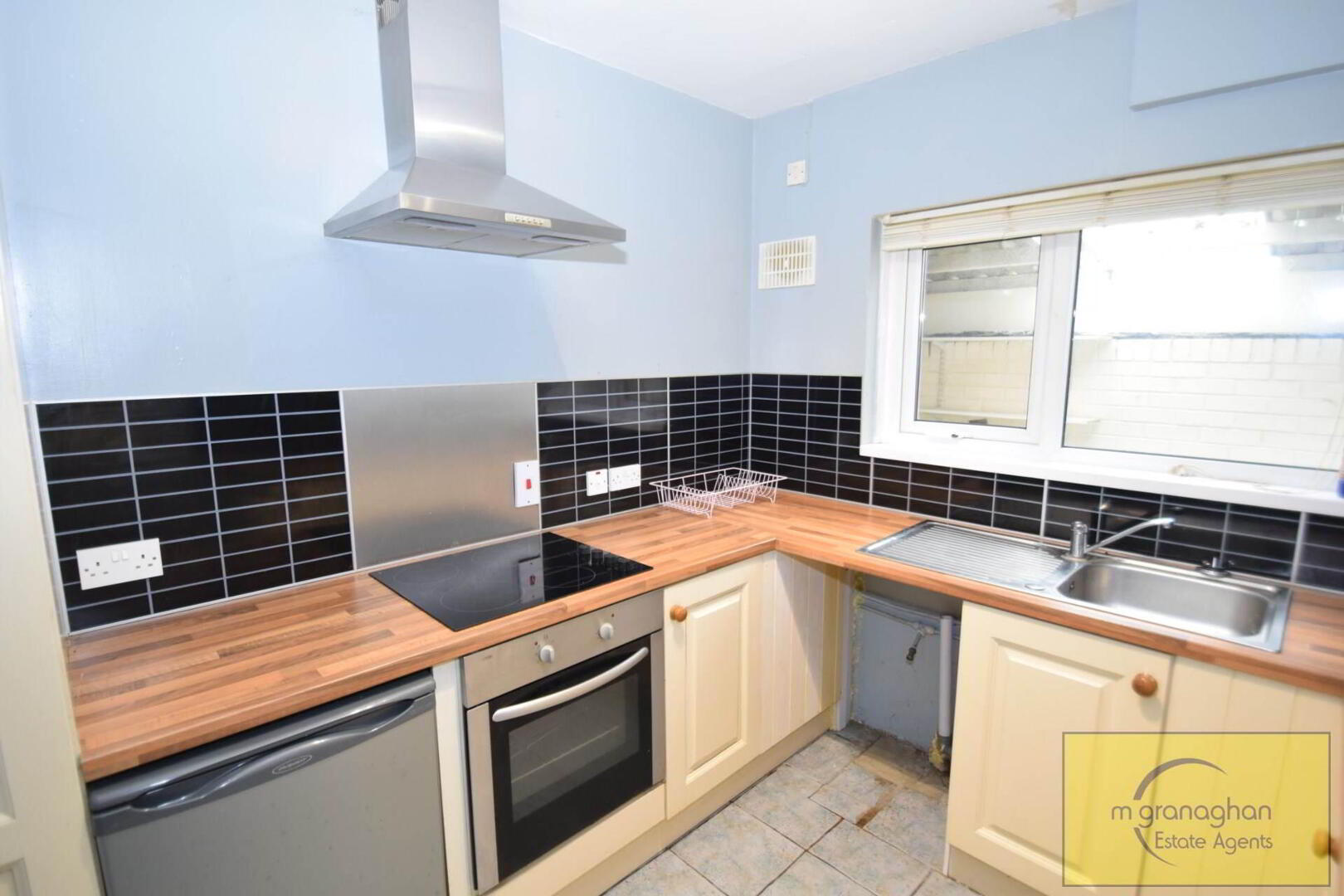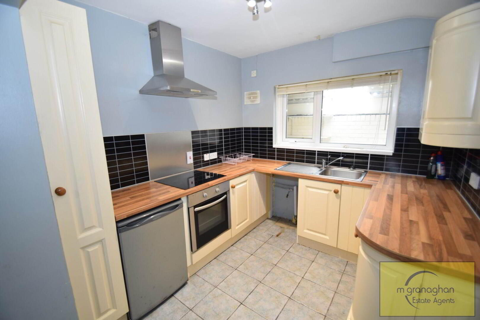 Modern fitted kitchen with a range of high and low level units, formica work surfaces, stainless steel sink drainer, ceramic hob with stainless steel back splash and overhead stainless steel extractor fan, plumbed for washing machine, part tiled walls and ceramic tiled flooring, access to dining area
