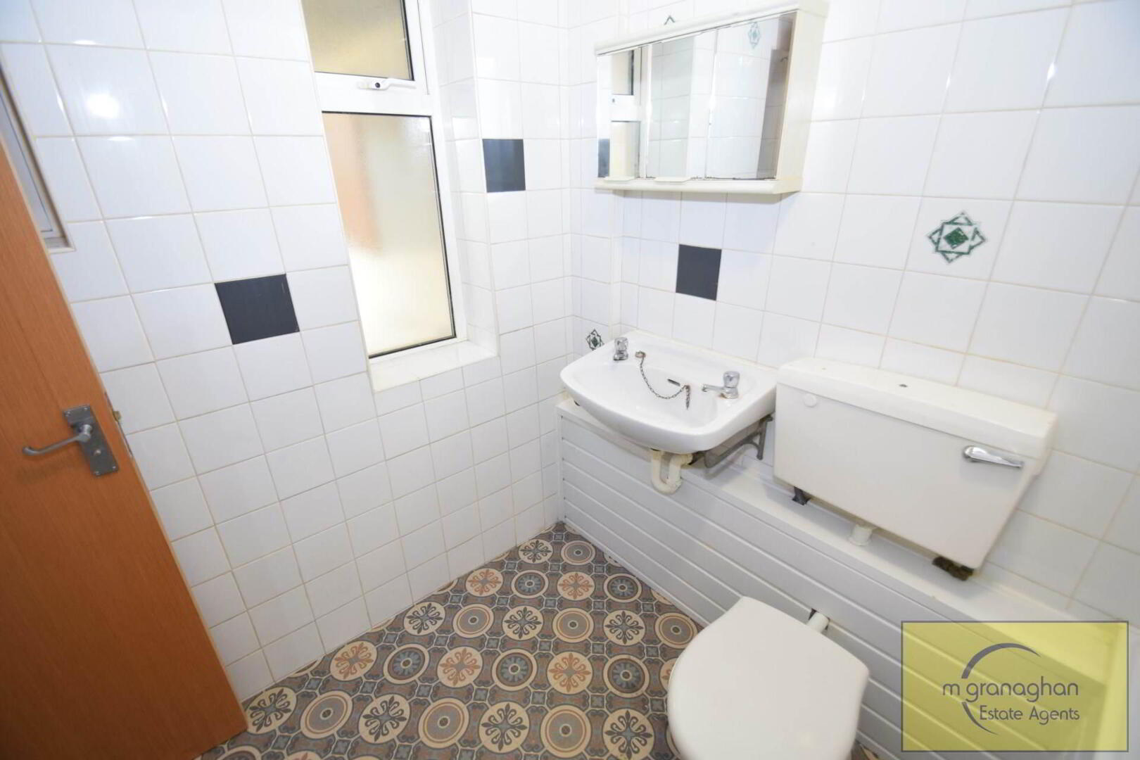 White suite comprising of panel bath with low flush WC, wash hand basin, ceramic floor and wall tiles