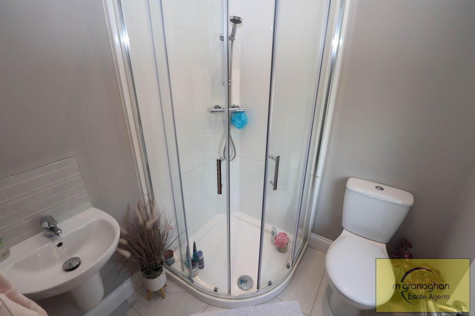 Walk in shower cubicle with overhead shower, free standing wash hand basin, low flush W/C, ceiling spotlights, ceramic tile floor, part tile walls