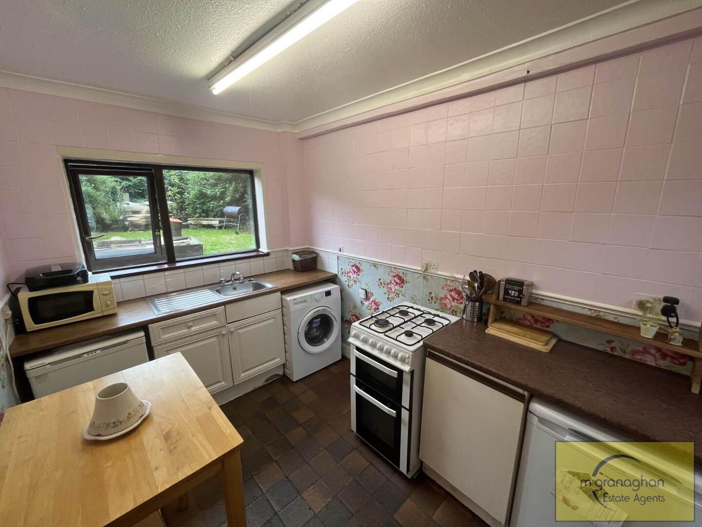 Family kitchen with low level units, formica work surfaces, plumbed for washing, part tiled walls, ceramic tiled flooring, overlooks rear garden