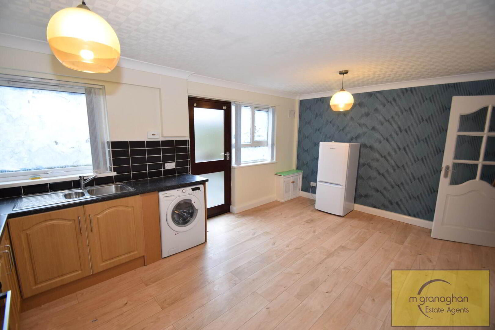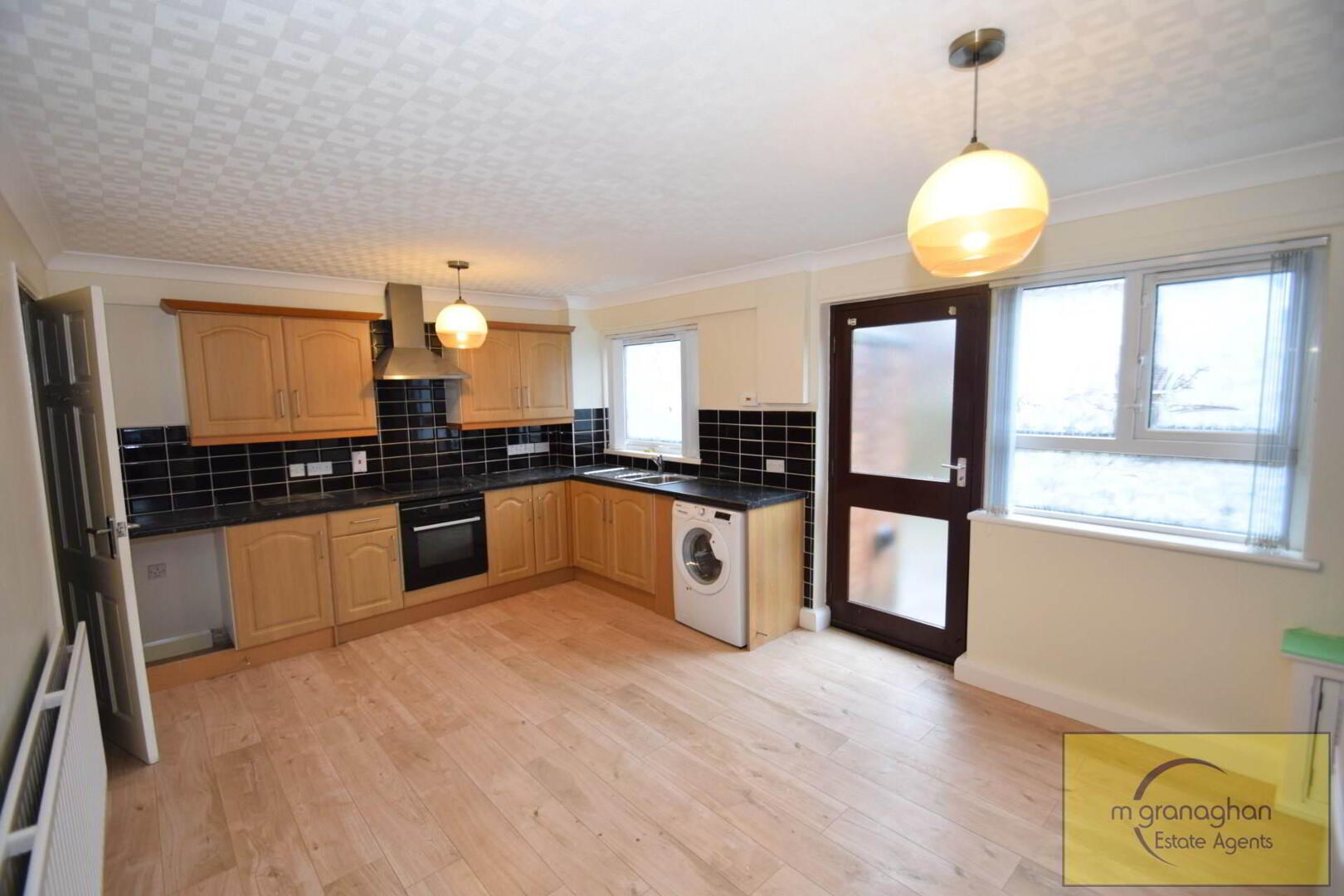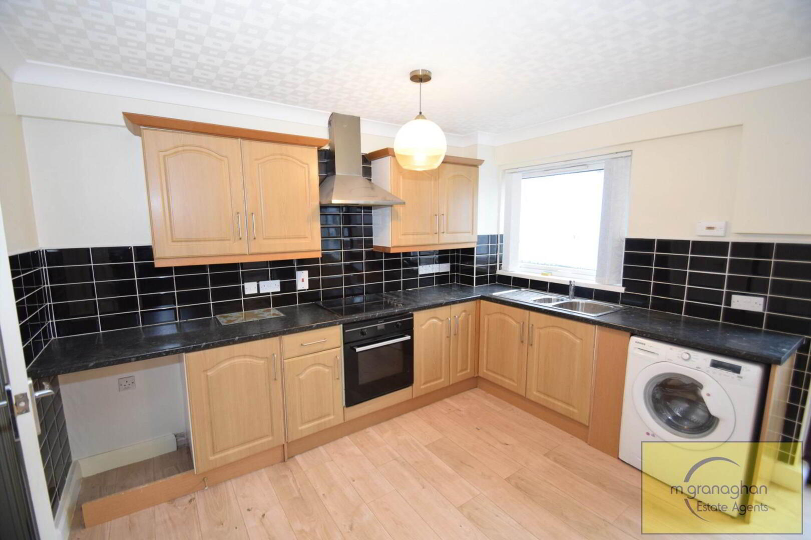 Modern fitted kitchen with a range of high and low level units, formica work surfaces, built in hob and oven with overhead extractor fan, plumbed for washing machine, access to rear