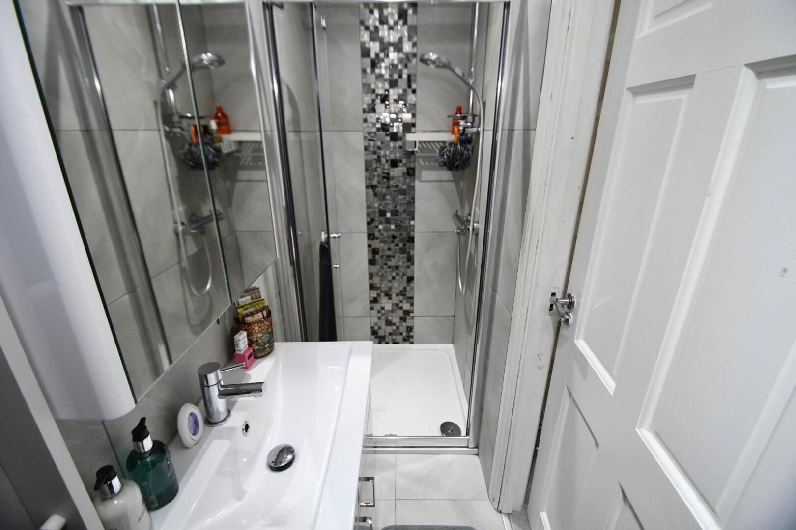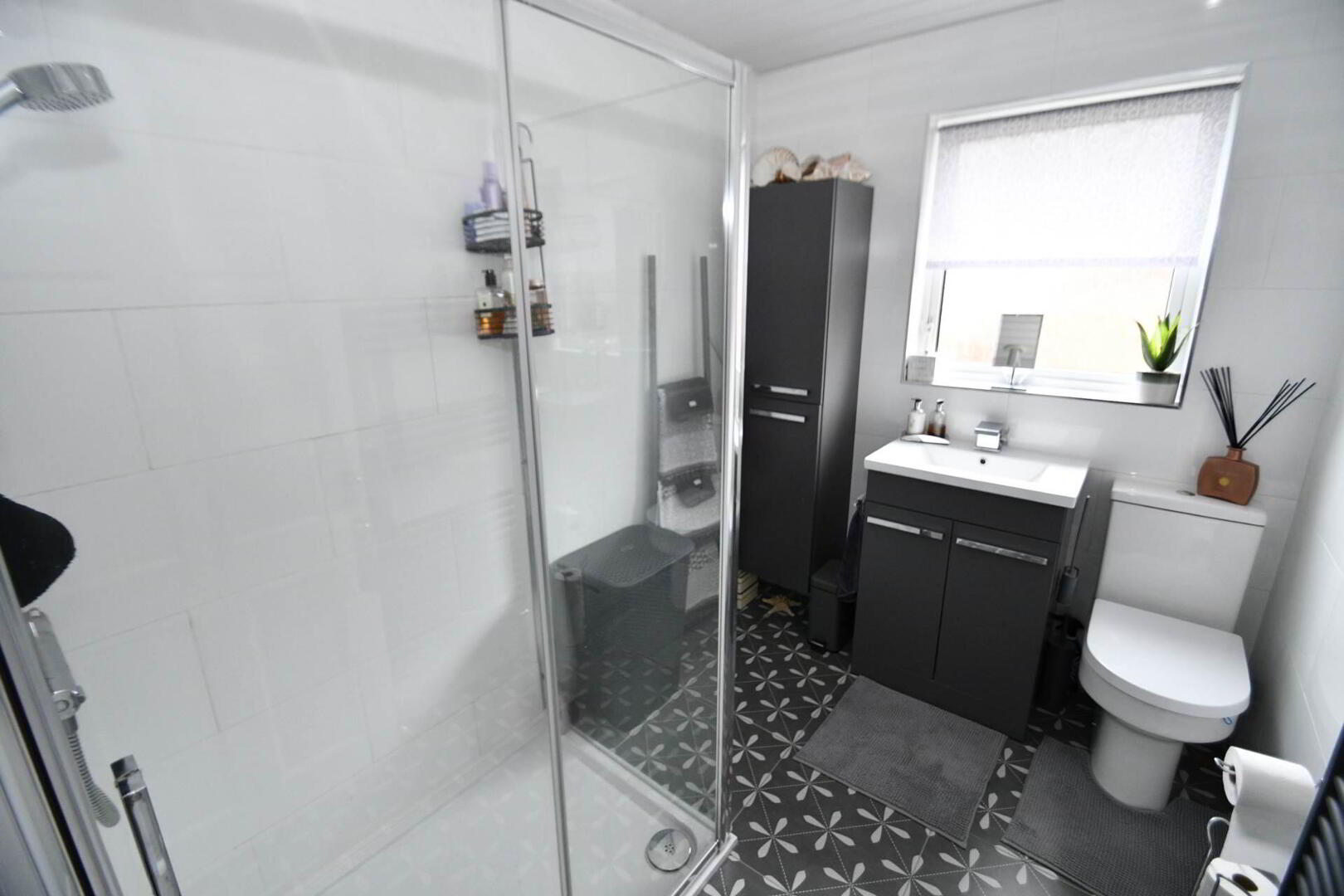 White family bathroom suite with walk in shower cubicle & over head shower screen, vanity unit wash hand basin, low flush W/C, fully tiled walls, ceramic tiled flooring, chrome towel rail, ceiling spotlights
