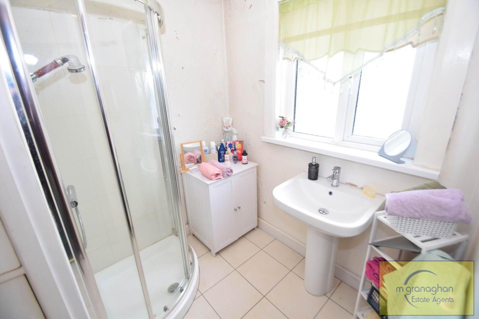 White suite comprising of shower cubicle, pedestal wash hand basin, ceramic floor and wall tiles