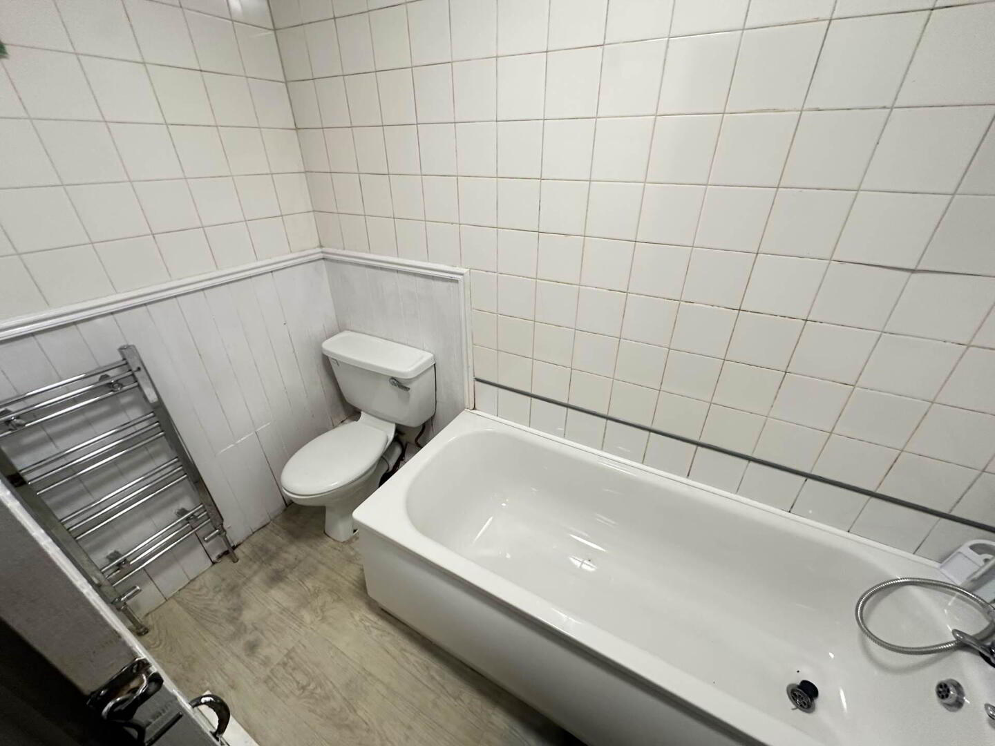 White bathroom suite comprising of panel bath, pedestal wash hand basin, low flush W/C, fully tiled walls, vinyl flooring