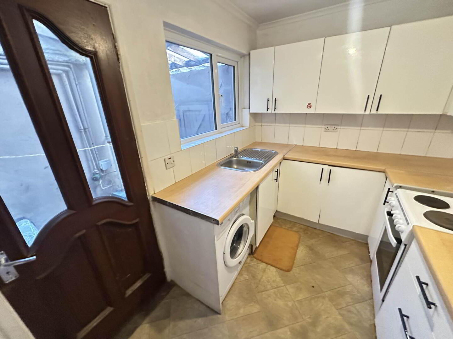 Range of high and low level units, formica work surfaces, stainless steel sink drainer, space for free standing cooker, plumb for washing machine, part tile walls, vinyl flooring