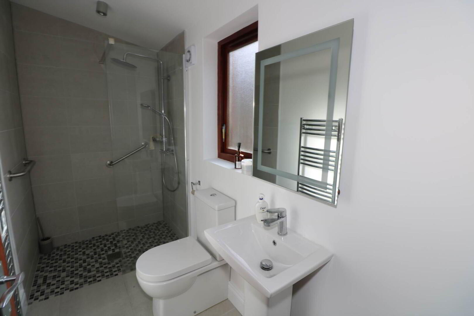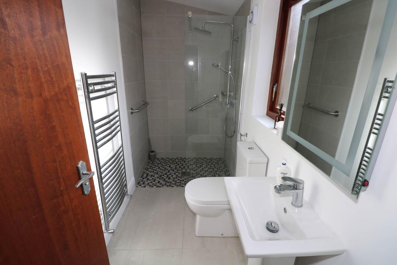 Modern wet room comprising of walk in shower, pedestal wash hand basin, low flush WC, ceramic tiled floor and part tiled walls, chrome towel radiator.