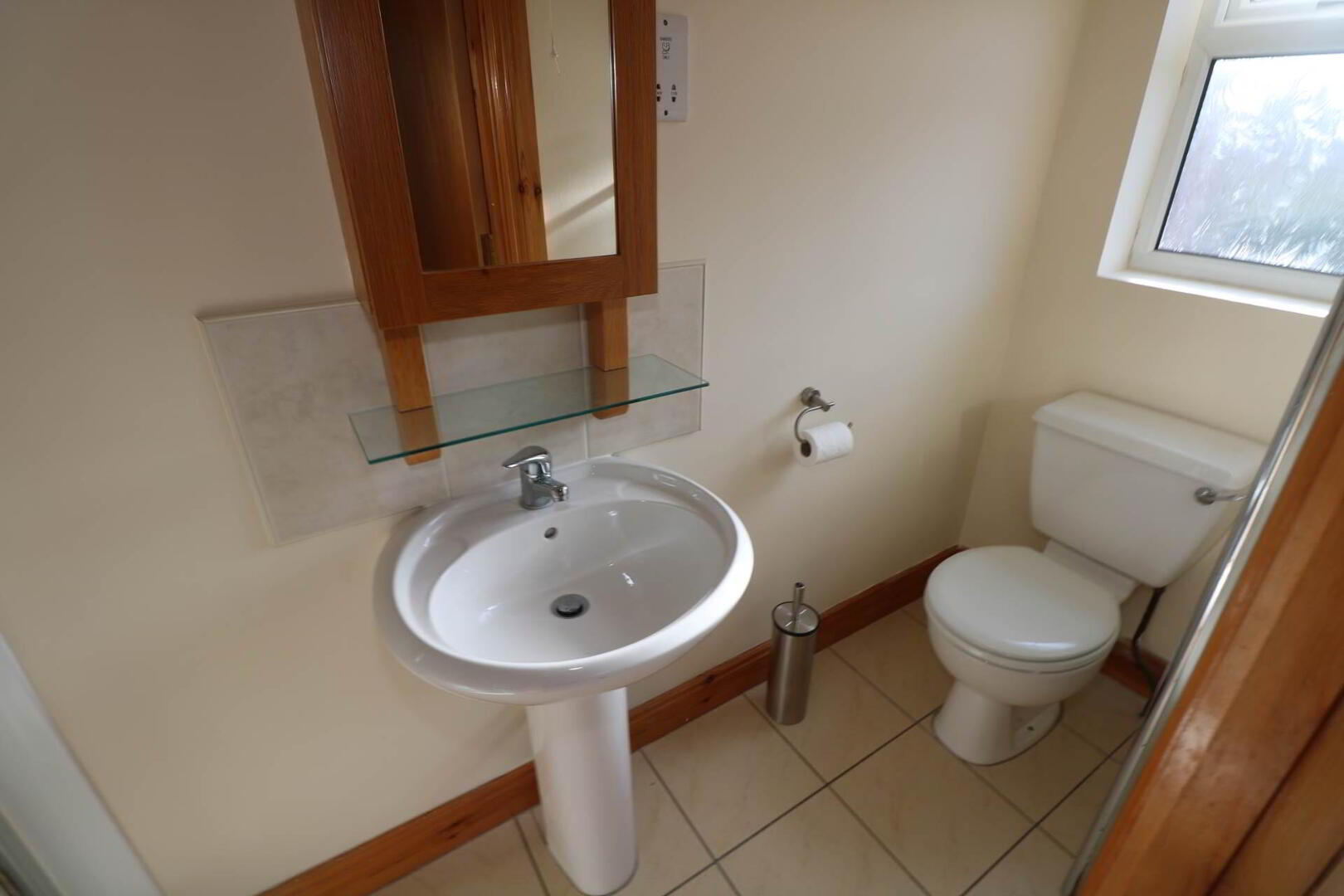 Shower cubicle, low flush WC, pedestal wash hand basin