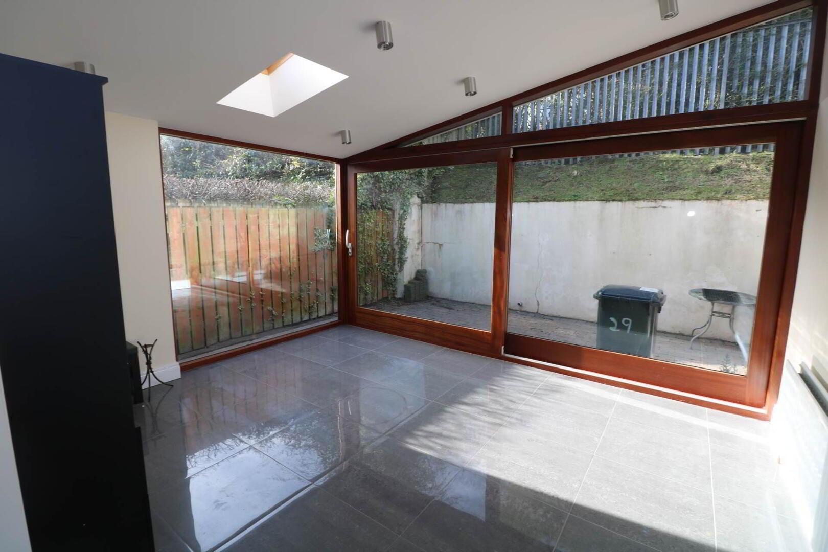 Porcelain tiled flooring, full length sliding doors, skylight, ceiling lighting