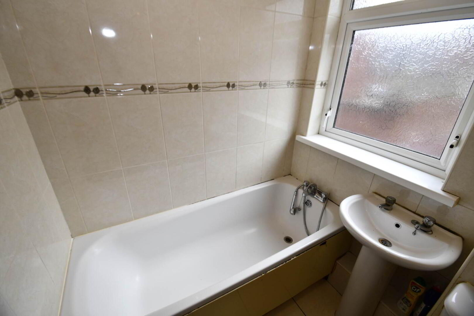 Panelled Bath, Low flush W.C, Pedestal wash hand basin, Ceramic tiled floor, Part tiled walls.