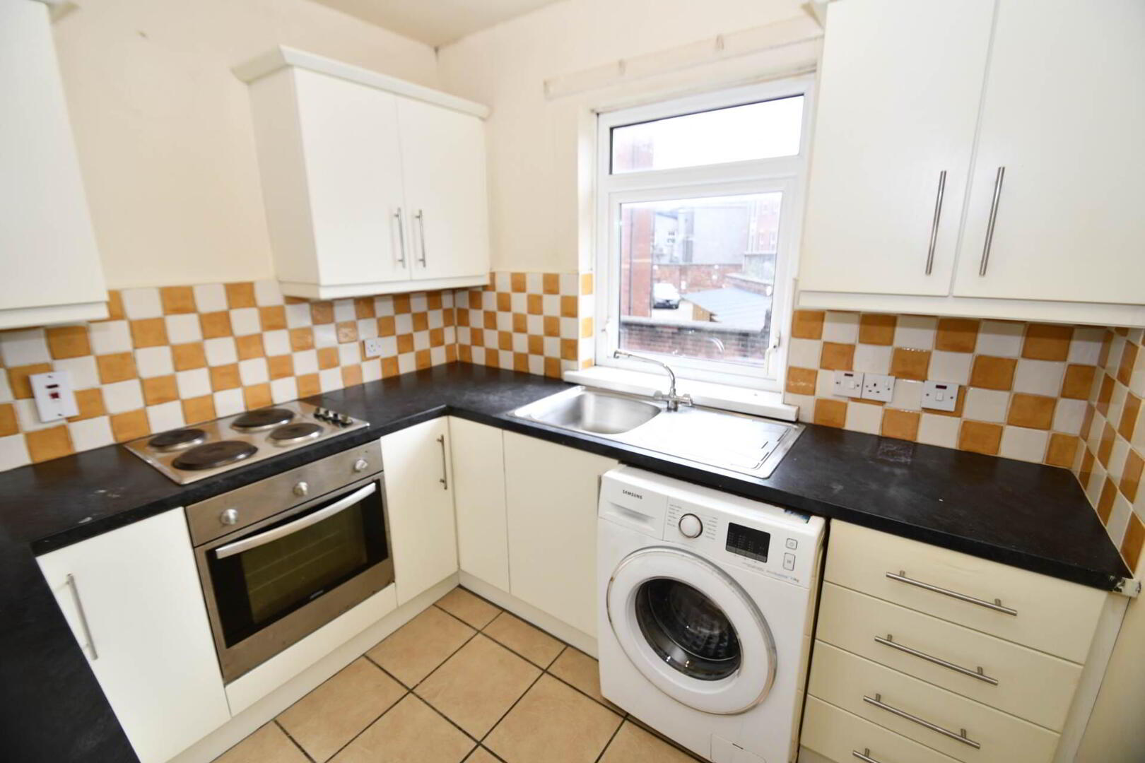 Kitchen with range of high and low level units, formica work surfaces, Single drainer stainless steel sink unit, Plumbed for washing machine, Part tiled walls and ceramic tiles floor.