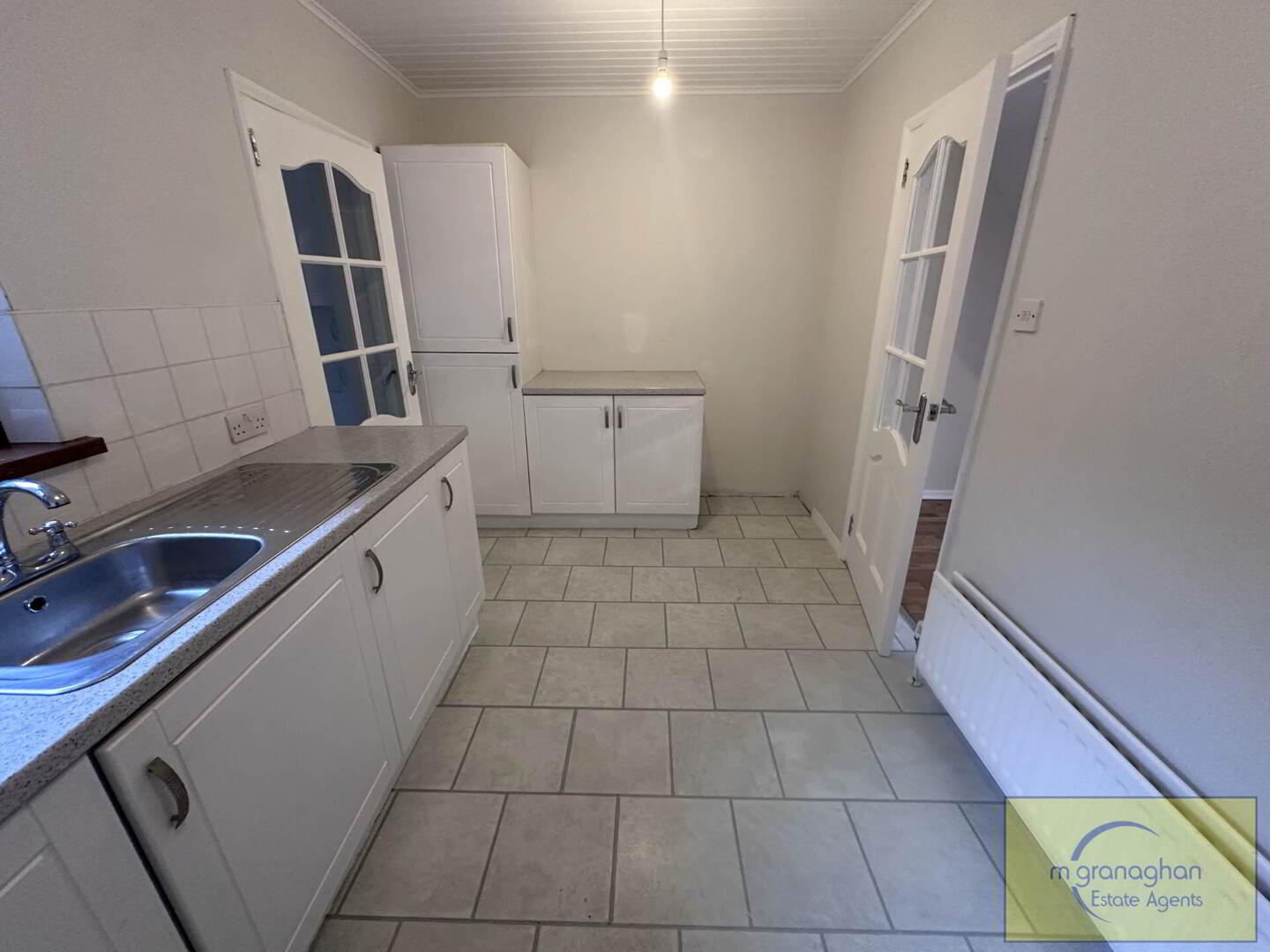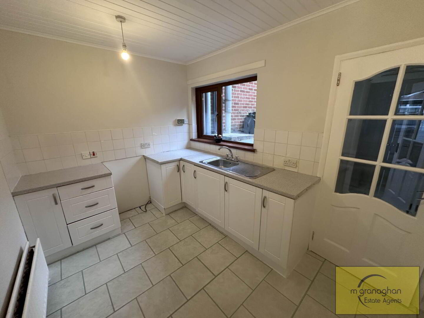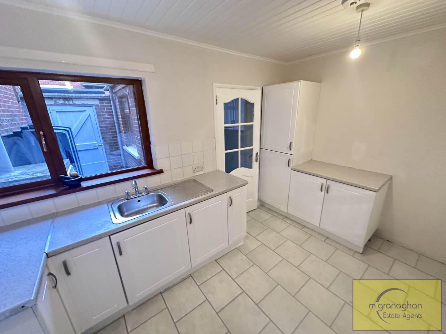 White kitchen with a range of low level units, formica work surfaces, stainless steel sink drainer, space for cooker, housing for fridge freezer, vinyl flooring, part tiled walls, PVC ceiling covering, access to hall and rear