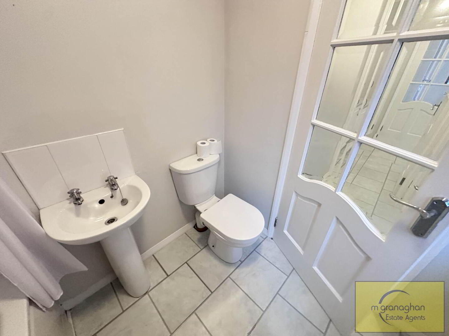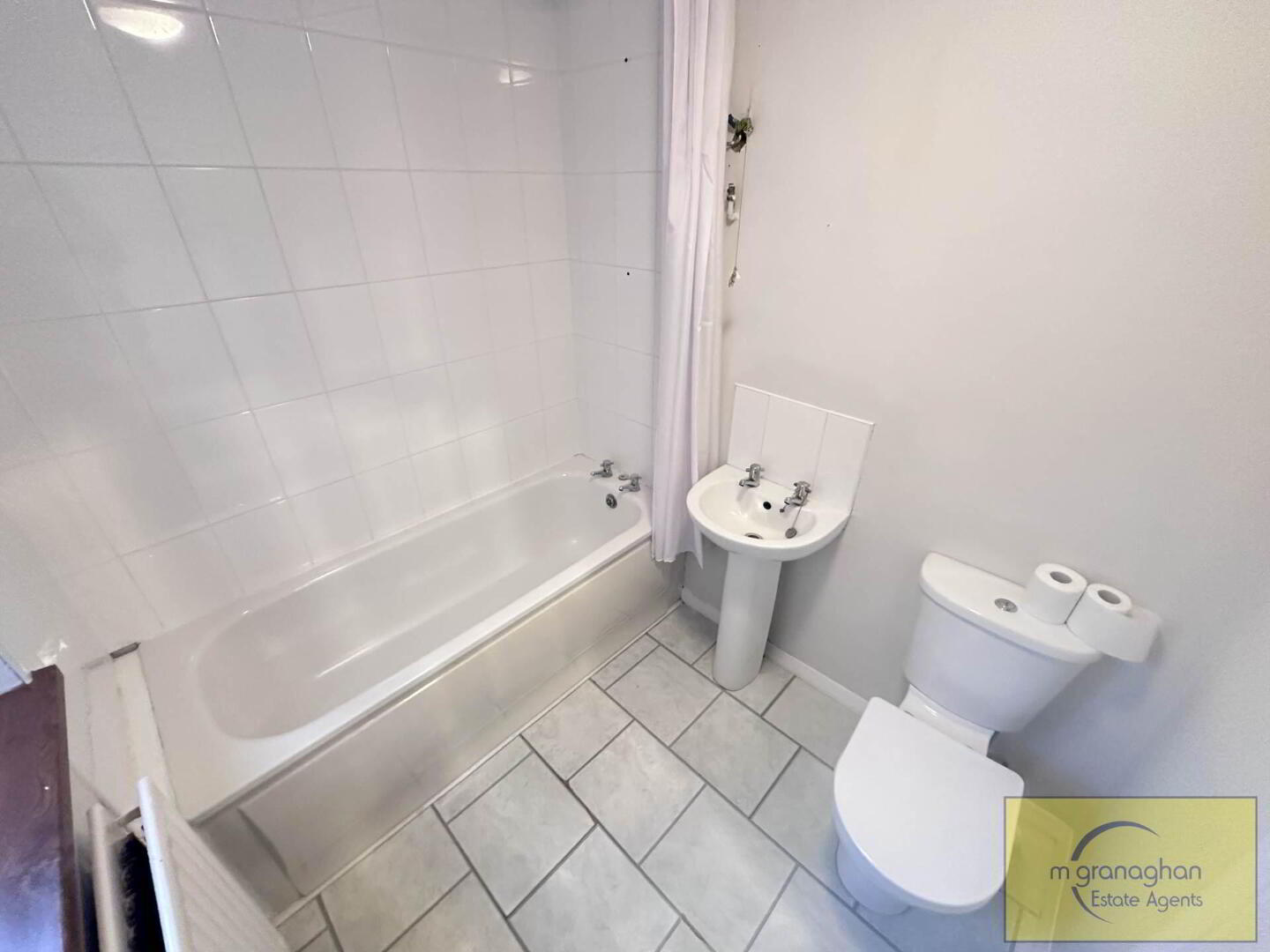 White bathroom suite with panel bath, pedestal wash hand basin, low flush WC, ceramic tiled flooring, part tiled walls