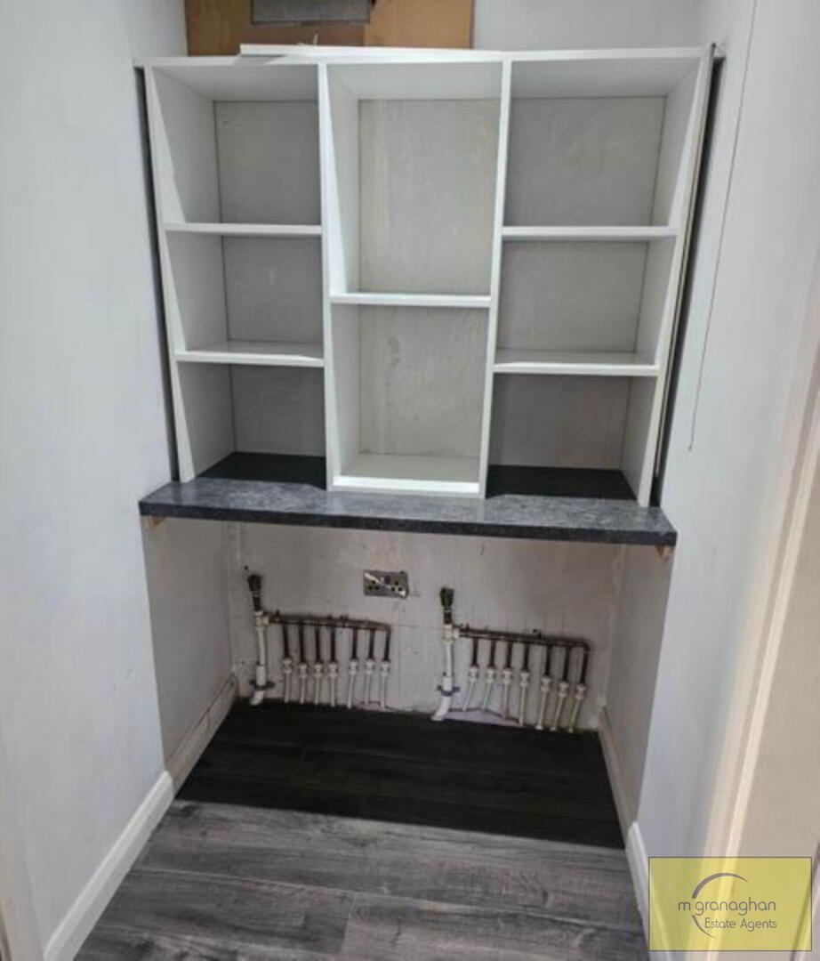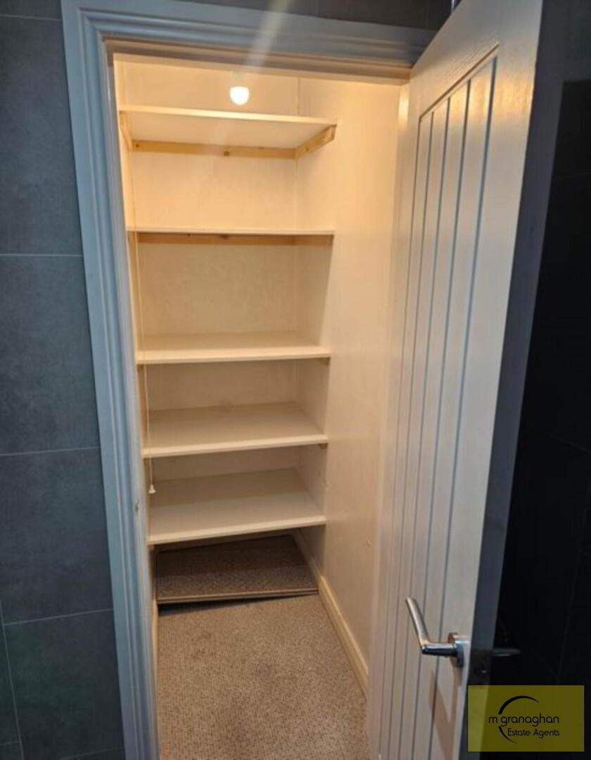 White family suite with shower cubicle, vanity unit hand wash basin, low flush W/C, pvc wall panelling, vinyl flooring, hotpress / storage, ceiling spotlights