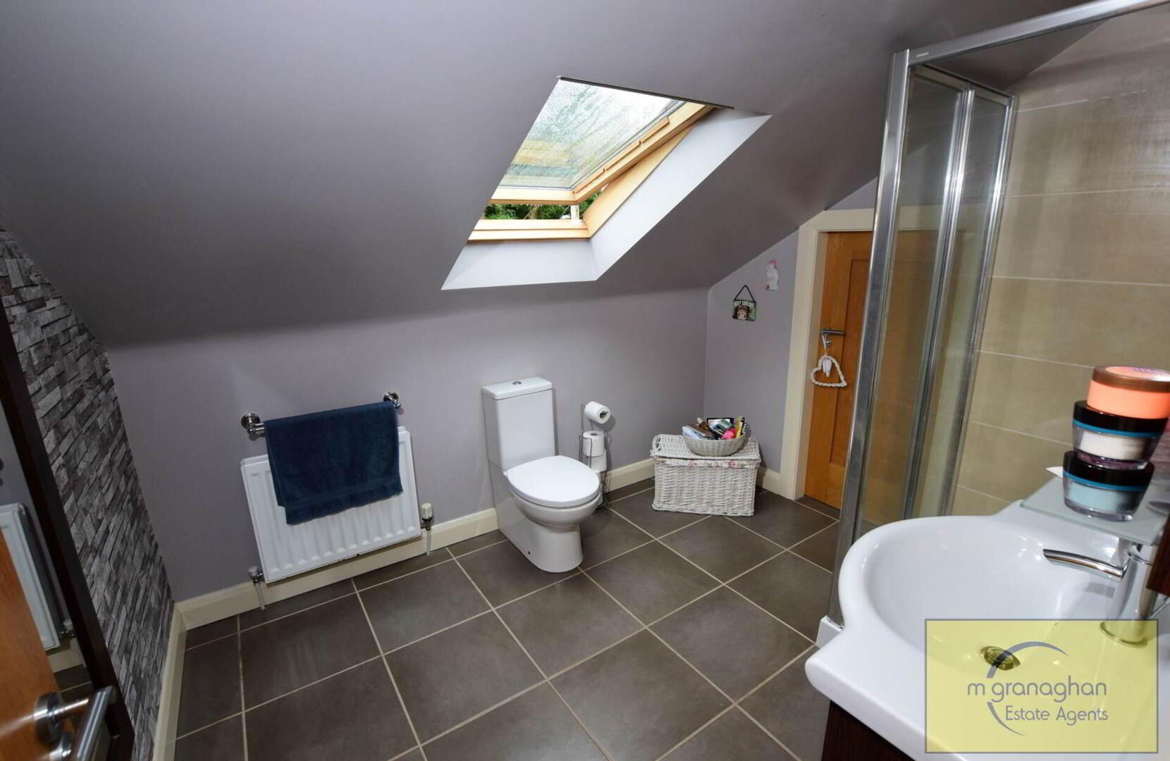 Shower cubicle with rainhead shower. Wash hand basin in vanity unit with matching mirror over. Low flush WC. Part tiled walls. Tiled floor. Double panelled radiator. Velux window.