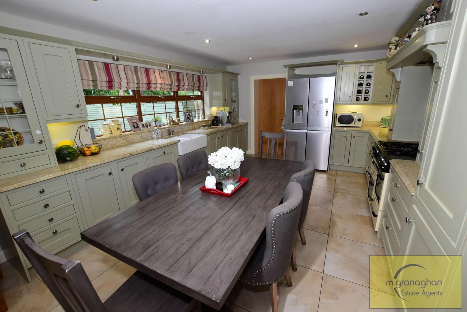 Luxury kitchen with an excellent range of high and low level units. Granite worksurfaces and upstands. Inset double `Belfast` sink, mixer tap. Pelmet over with downlighters. Integrated dishwasher. Space for range style cooker. Extractor fan in overmantle. Granite splashback. Plumbed for american style fridge/freezer. Pan drawers. Wine rack. Glazed display cabinets with lights. Under unit lighting. Tiled floor. Downlighters. Vertical radiator.