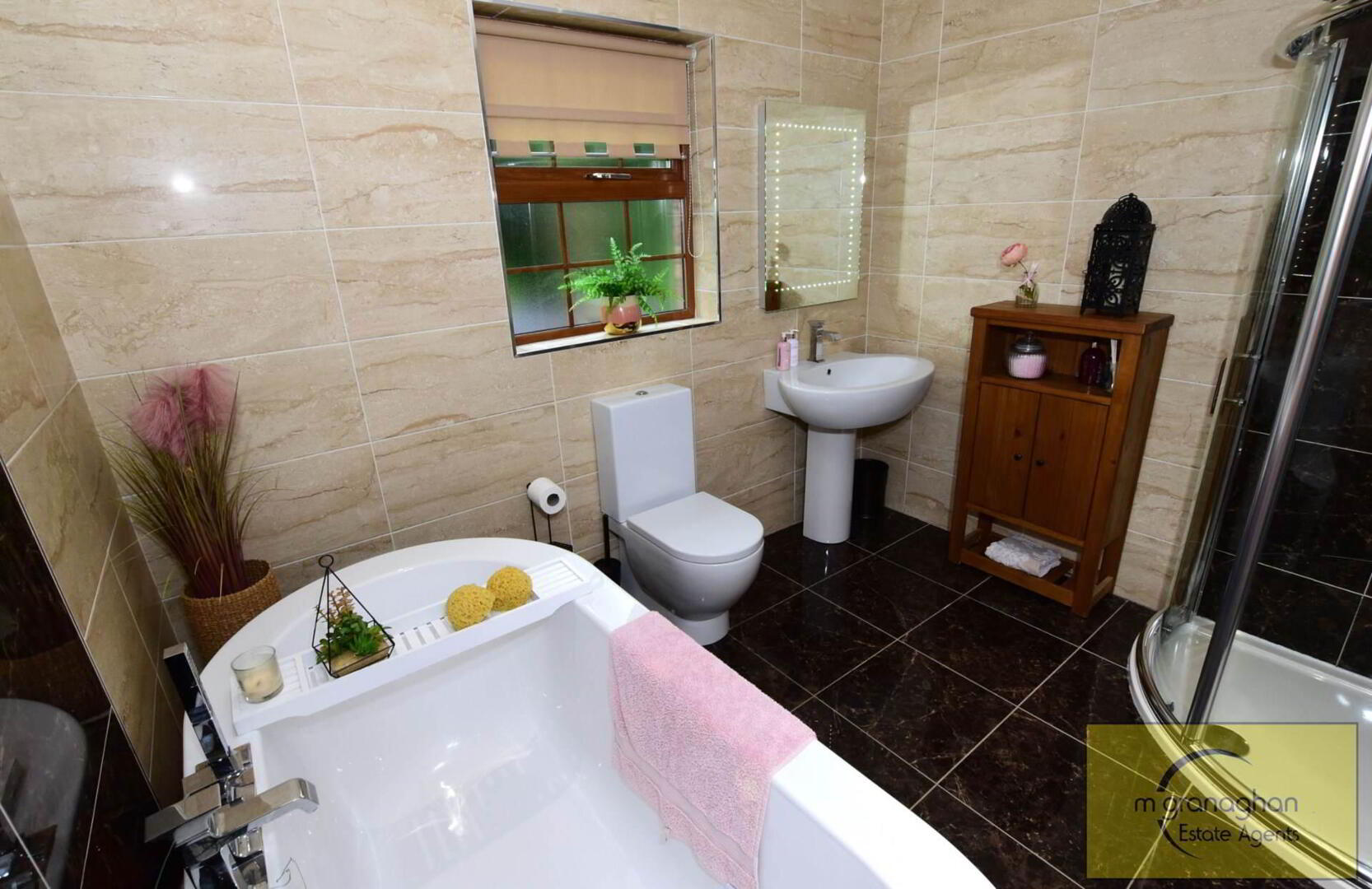 Free standing bath with mixer tap and shower attachment. Quadrant shower cubicle with rain head shower. Pedestal wash hand basin, mixer tap. Low flush WC. Wall and floor tiling. Extractor fan. Double panelled radiator. Downlighters.