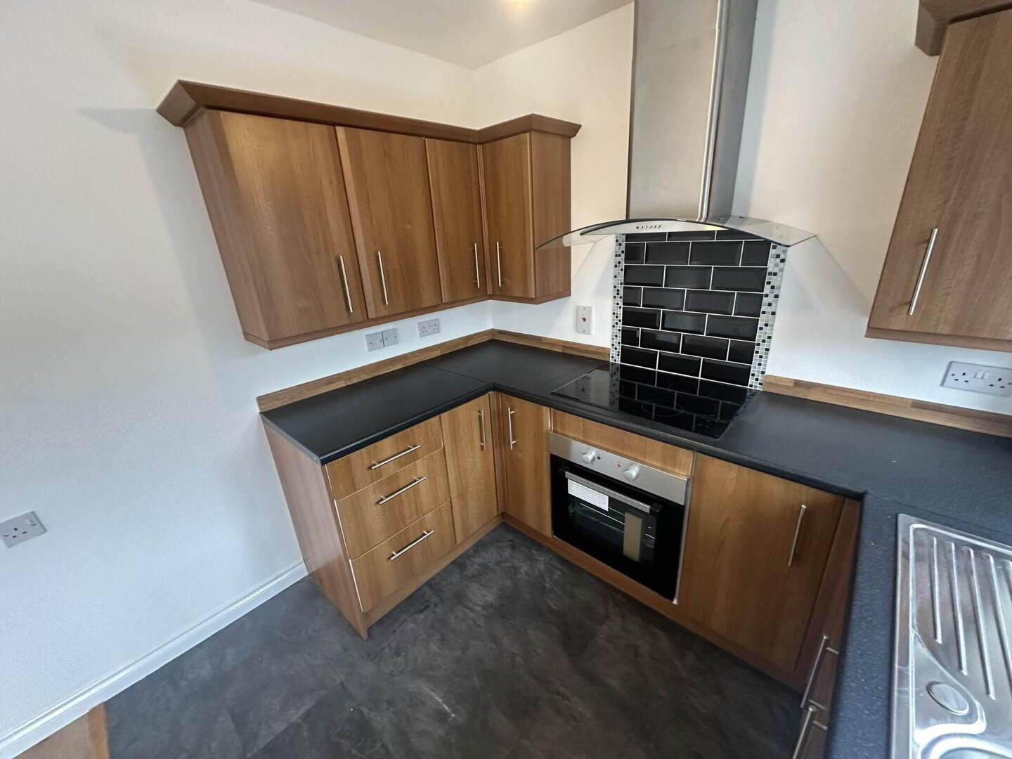 Fitted kitchen with a range of high and low level units, formica work surfaces, stainless steel sink drainer, built in oven and hob with overhead stainless steel extractor, plumbed for washing machine leads to dining area, tiled splash back, laminate tiled flooring