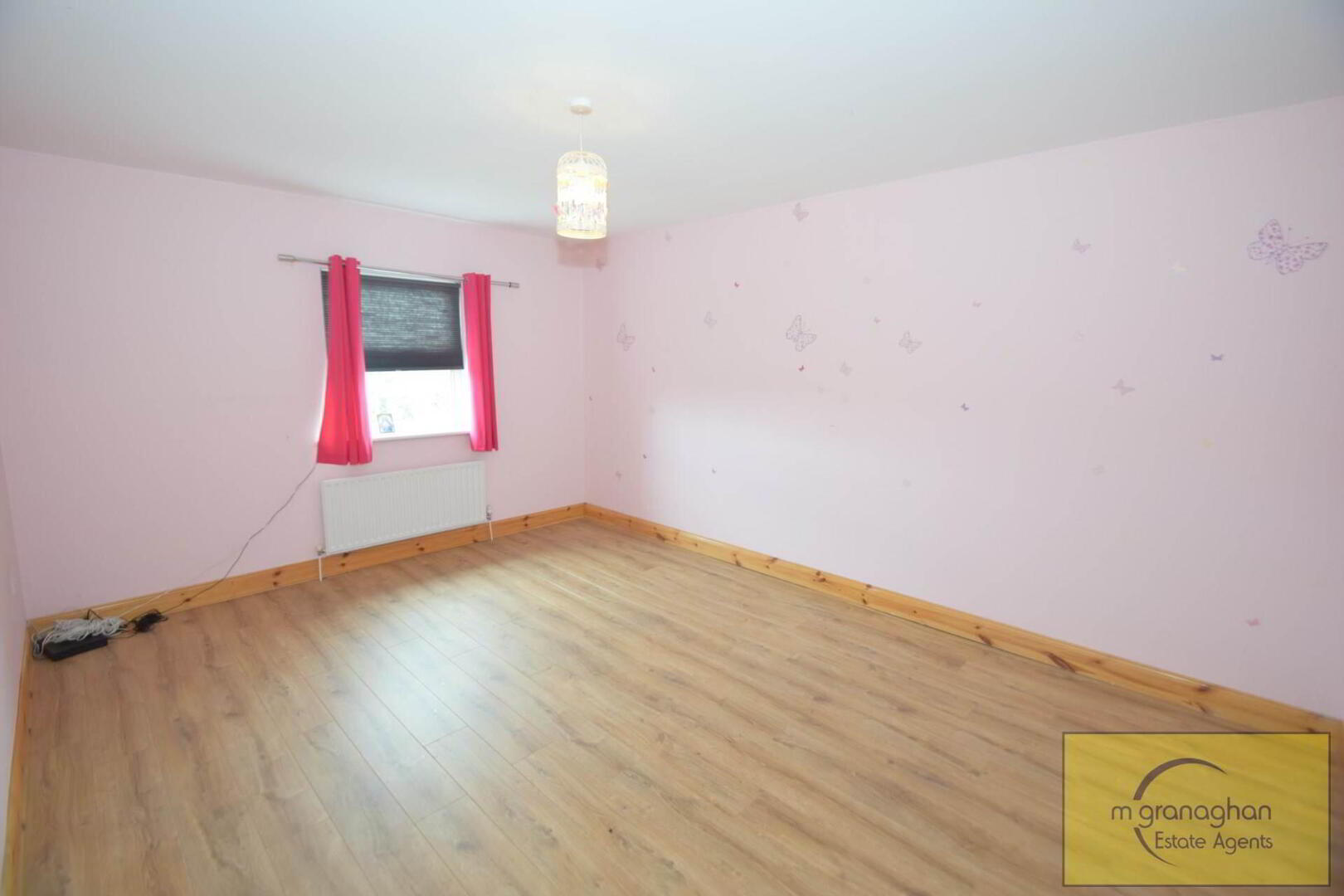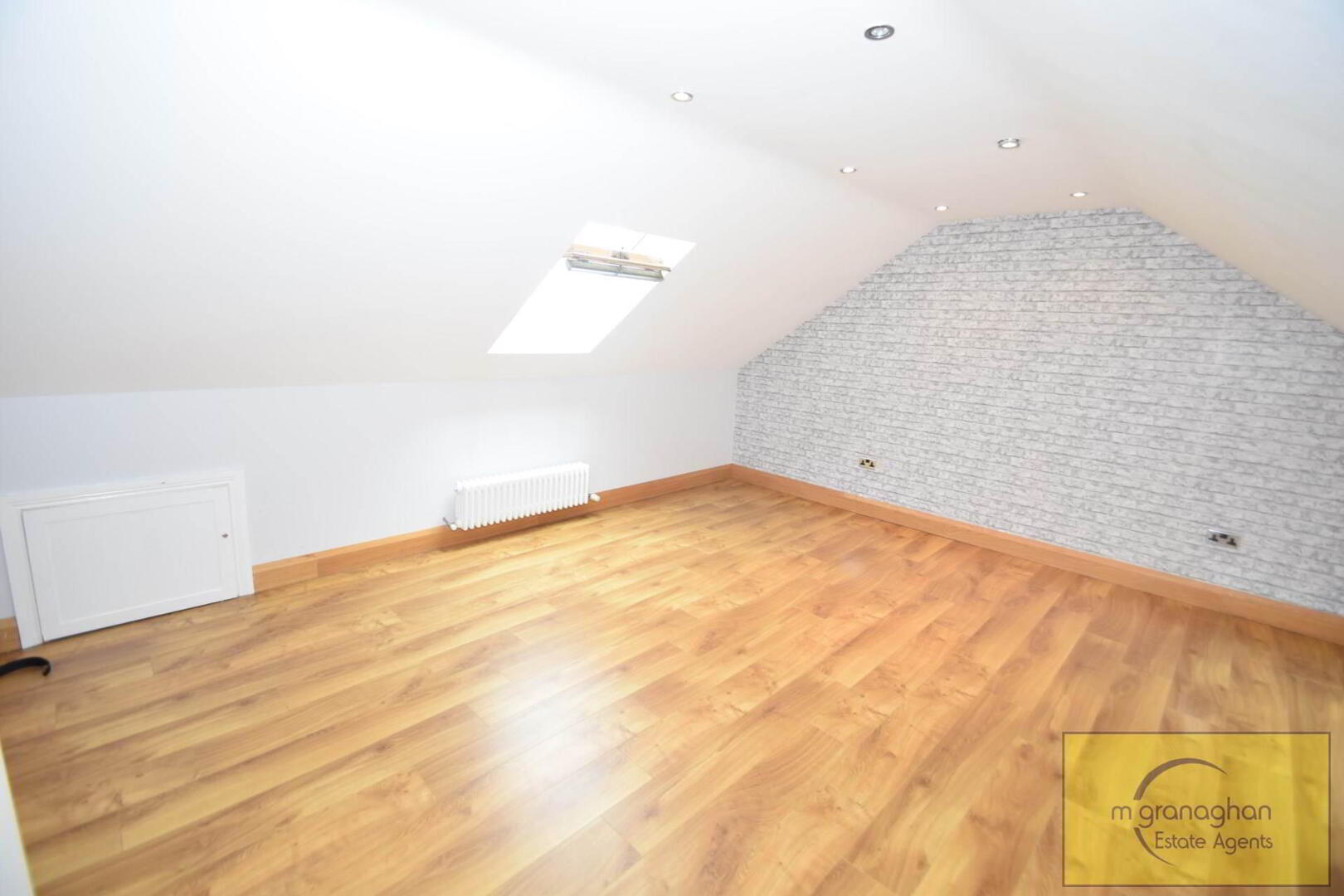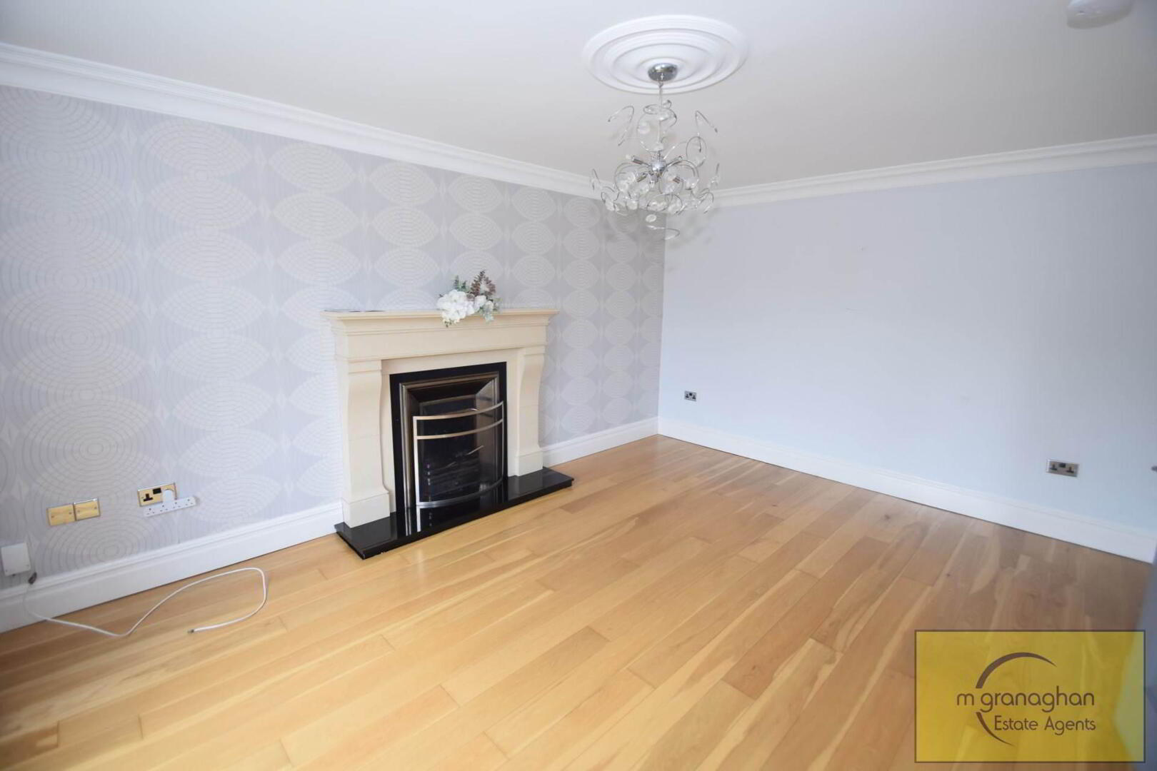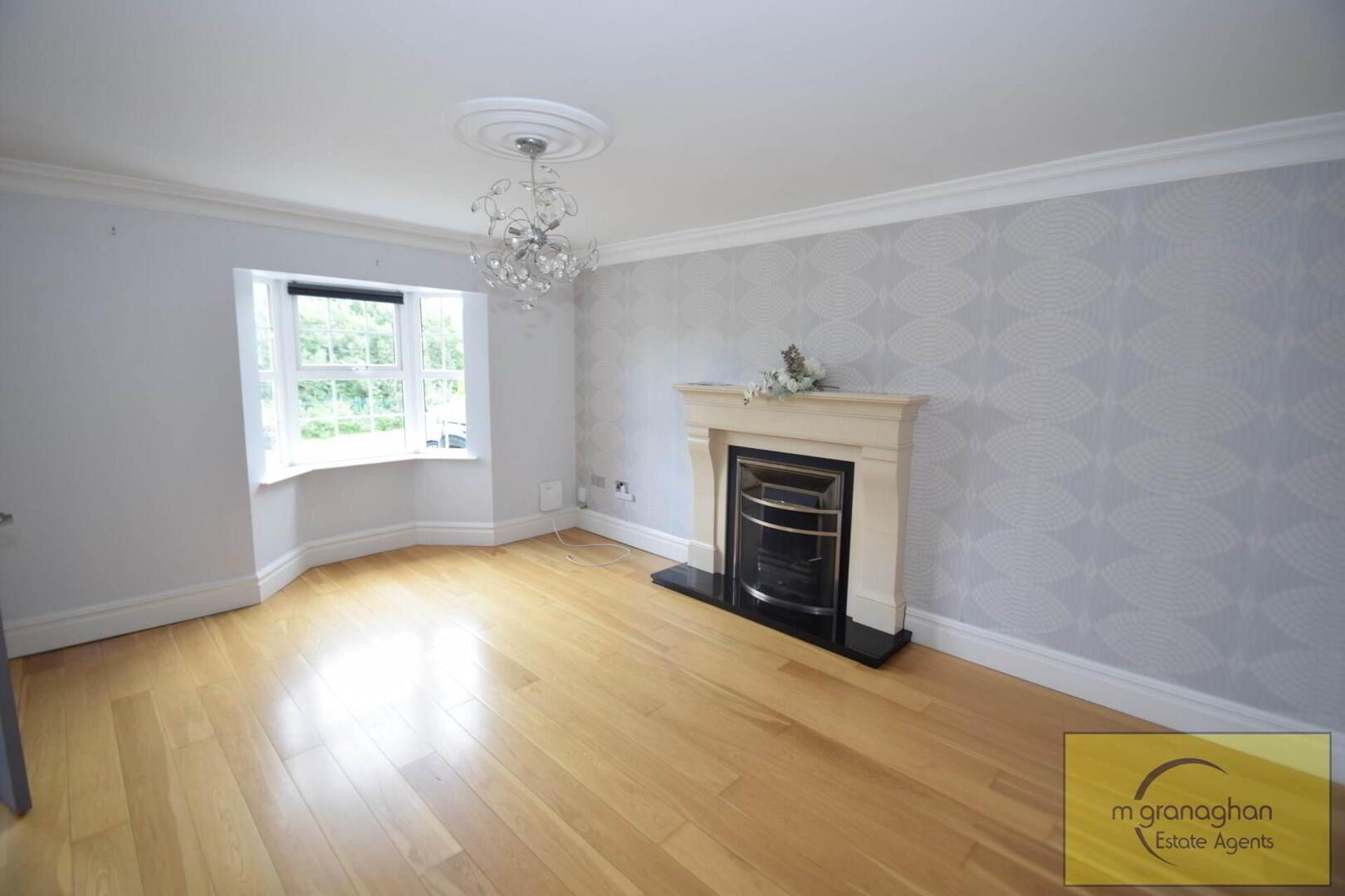 Wooden flooring, feature fire place, bay window