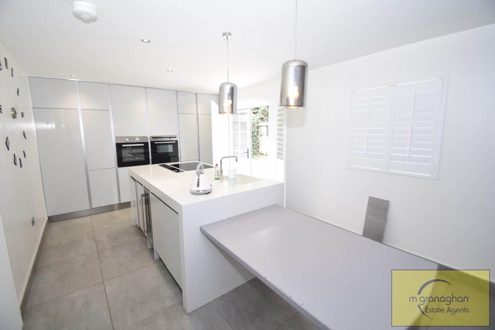 Modern fully fitted kitchen, integrated hob, double oven, breakfast bar, built in fridge, built in freezer, wine rack, quooker taps