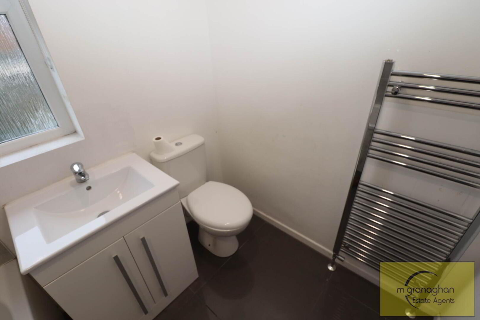 White suite comprising of bath with shower screen vanity unit wash hand basin, low flush WC,chrome radiator, part tiled PVC walls, laminate tiled flooring