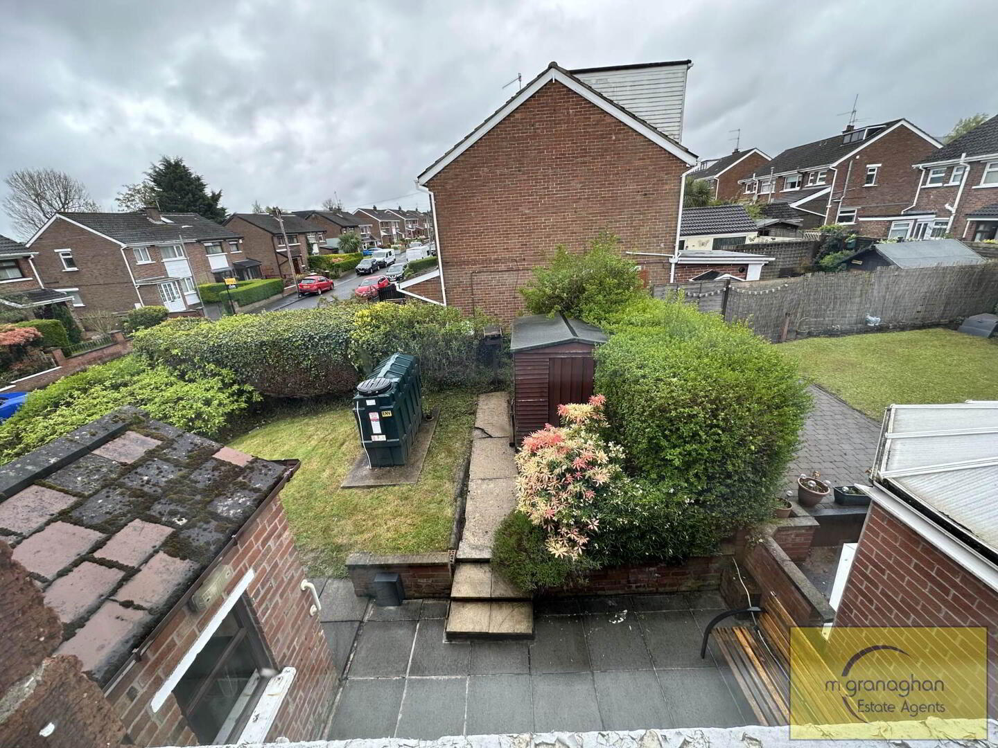 Driveway, Garden in lawn with mature shrubs to front, enclosed garden in lawn to side