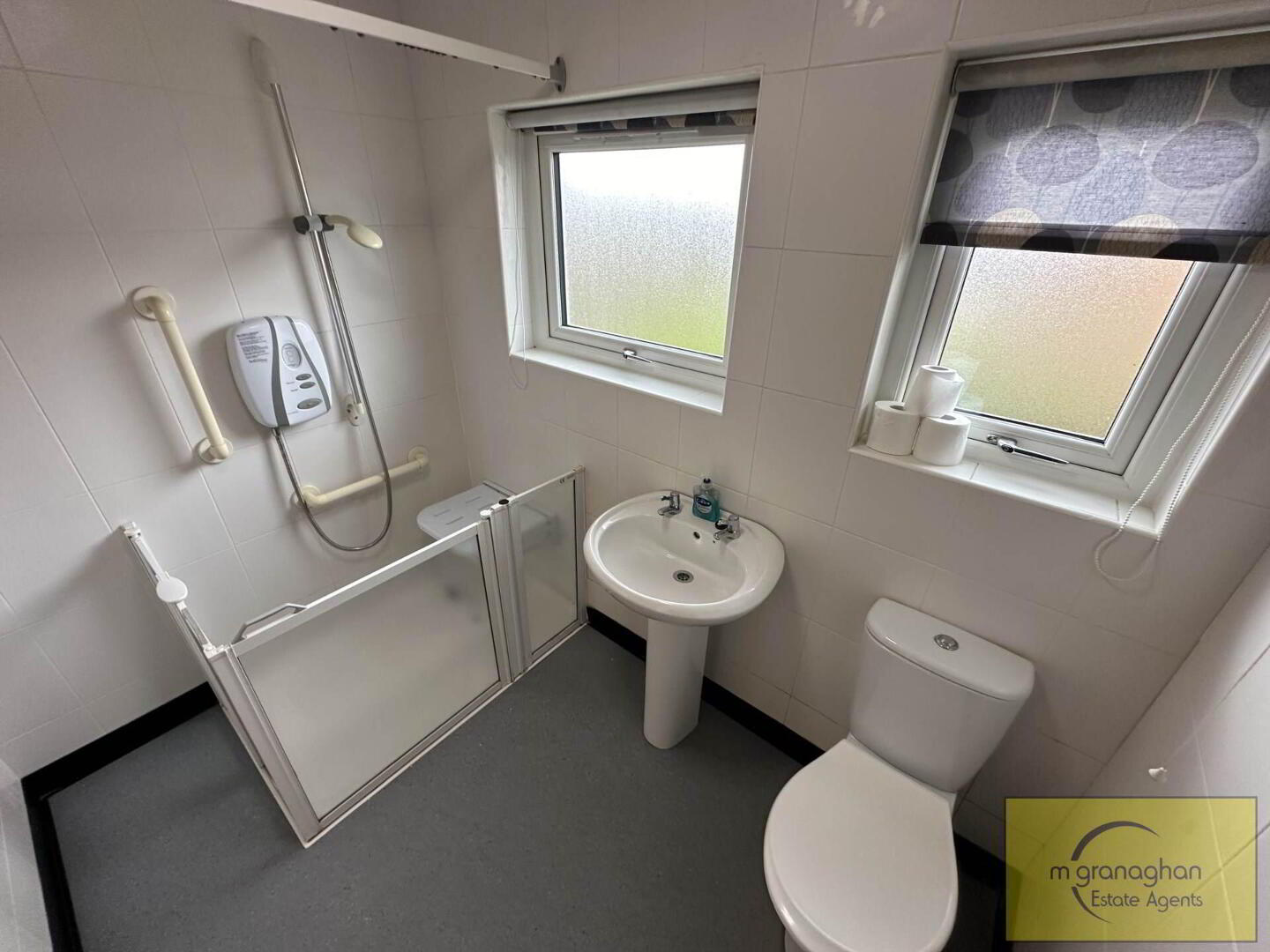Low flush WC, panelled wash hand basin, fully tiled walls, walk in shower