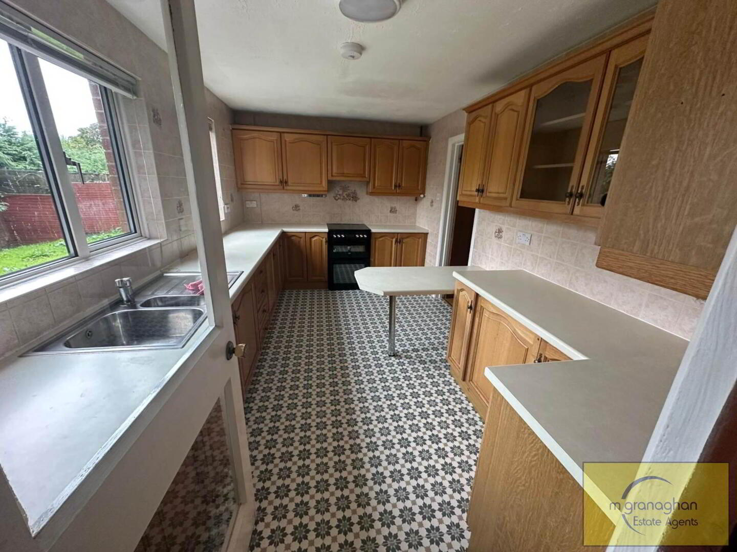 Range of high and low level units, Formica work surfaces, stainless steel sink drainer, partially tiled walls, ceramic tiled floor