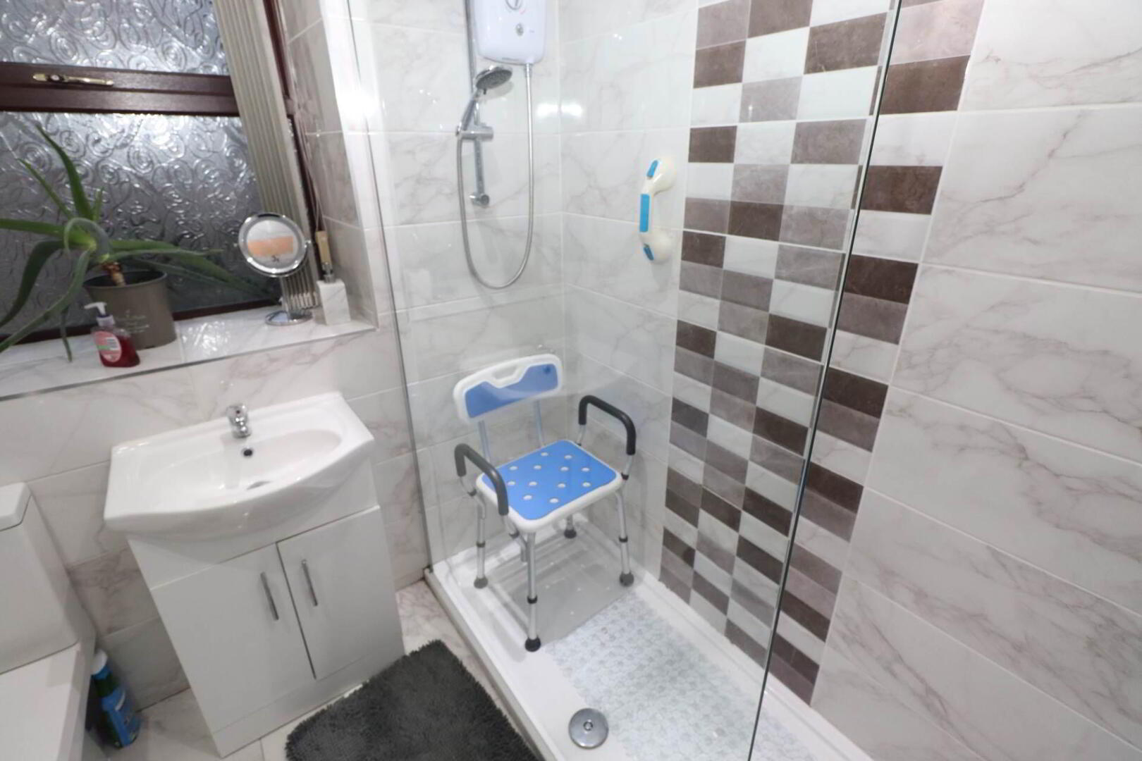 White bathroom suite comprising of walk in shower cubicle, vanity unit wash hand basin, low flush W/C ceramic tiled flooring, fully tiled walls