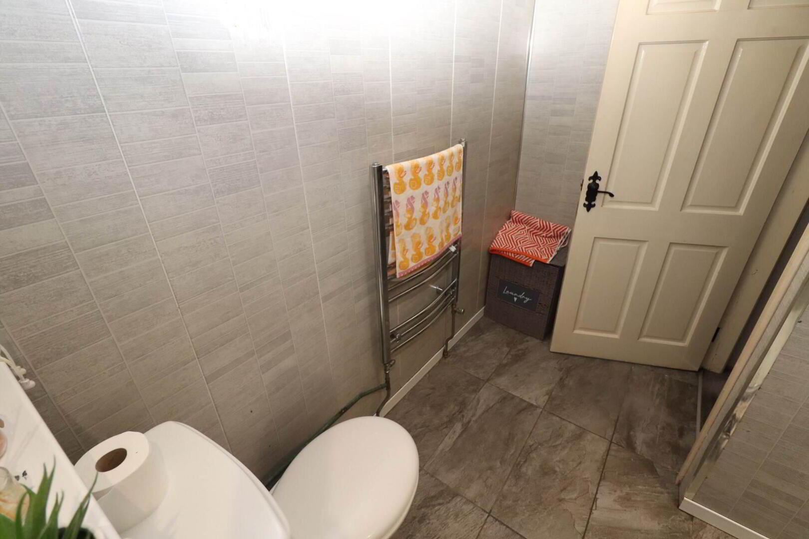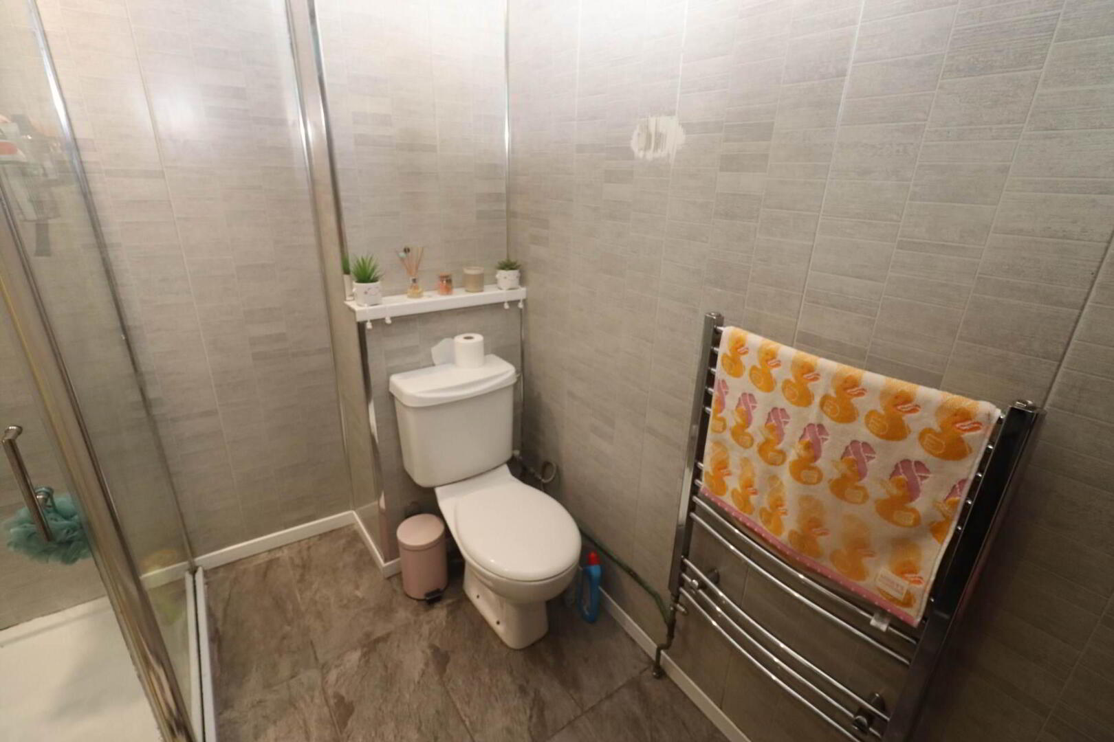 White suite comprising of walk in shower, low flush WC, vanity unit wash hand basin, pvc wall covering, chrome towel radiator, ceramic tiled flooring.