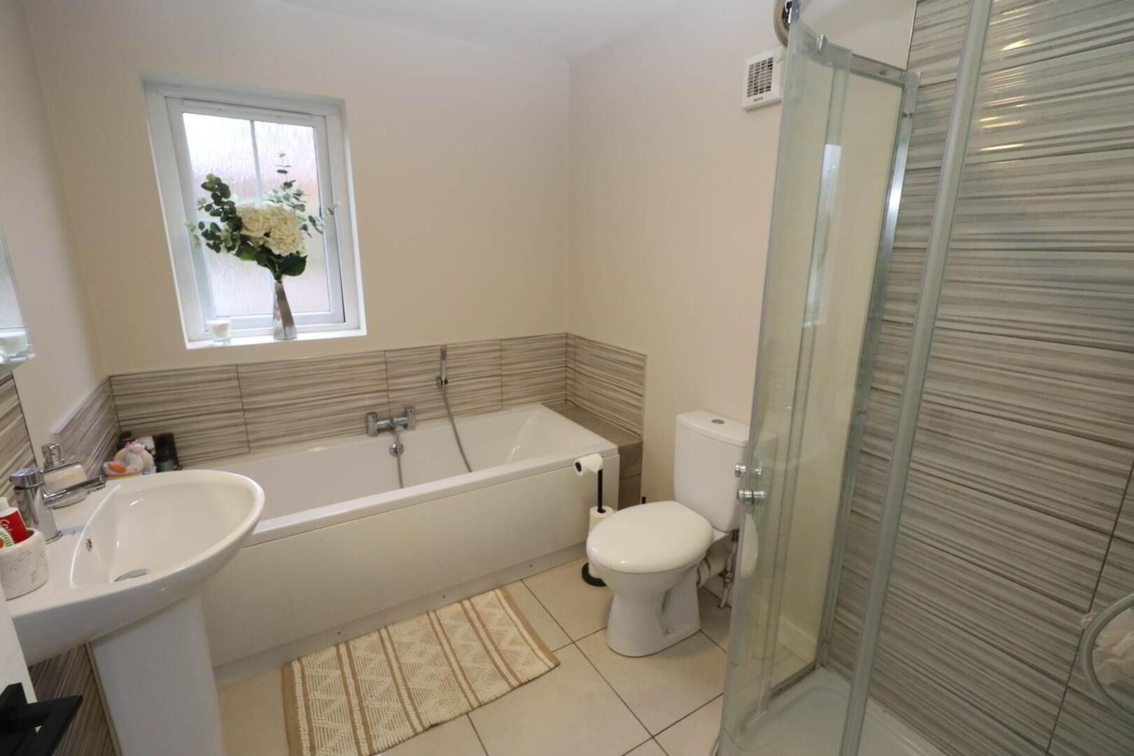 White family bathroom suite with panel bath & separate walk in shower cubicle, pedestal wash hand basin, low flush W/C, part tiled walls, ceramic tiled flooring