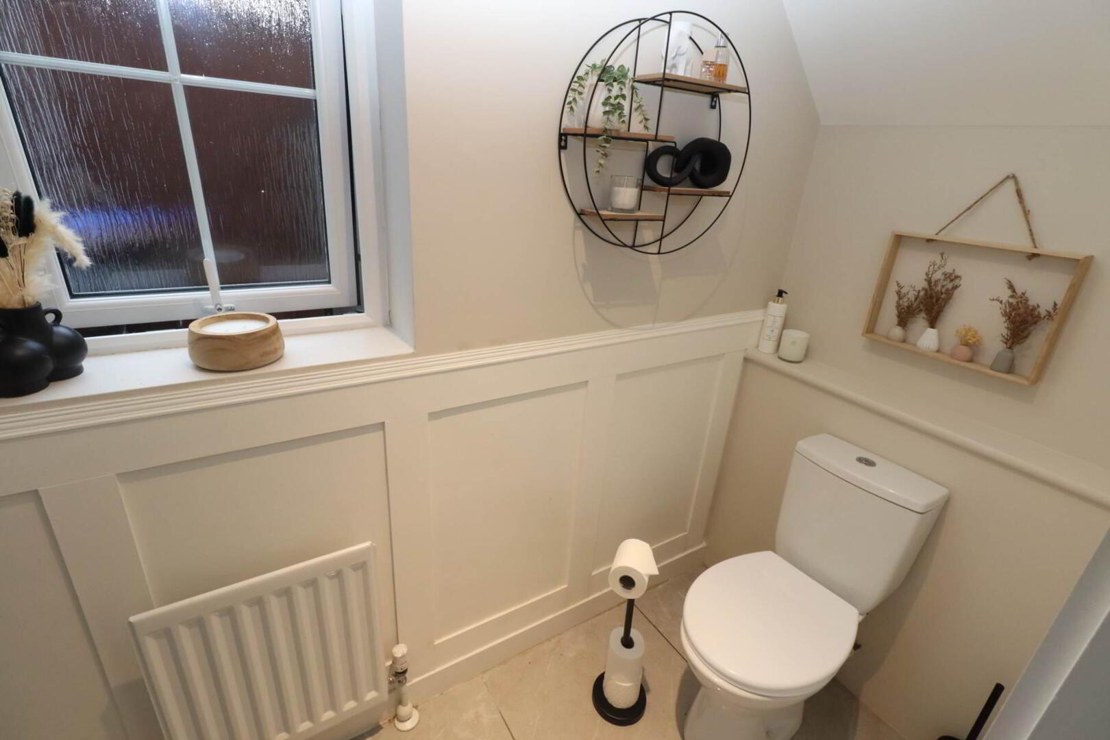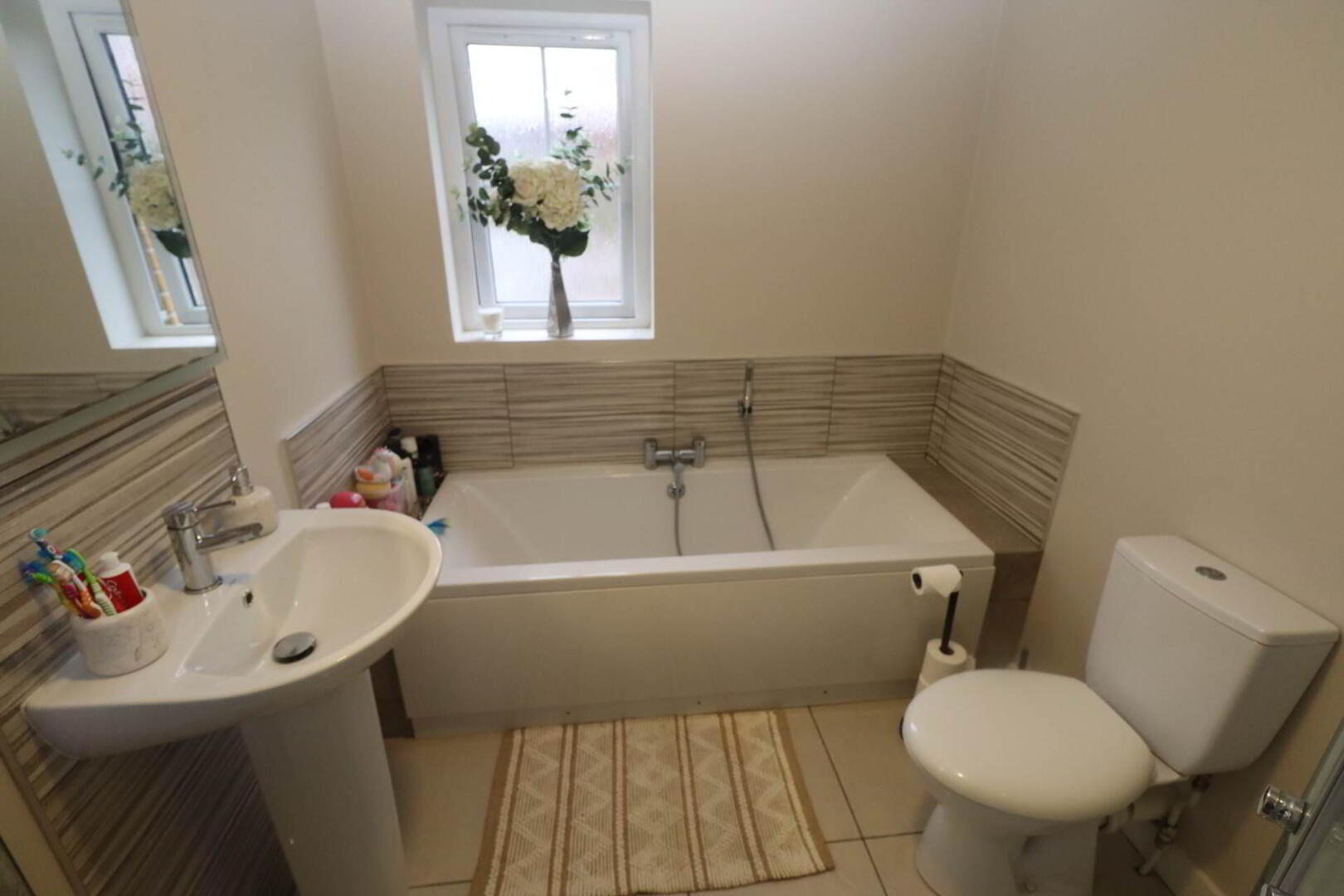 Pedestal wash hand basin, low flush W/C, ceramic tiled flooring