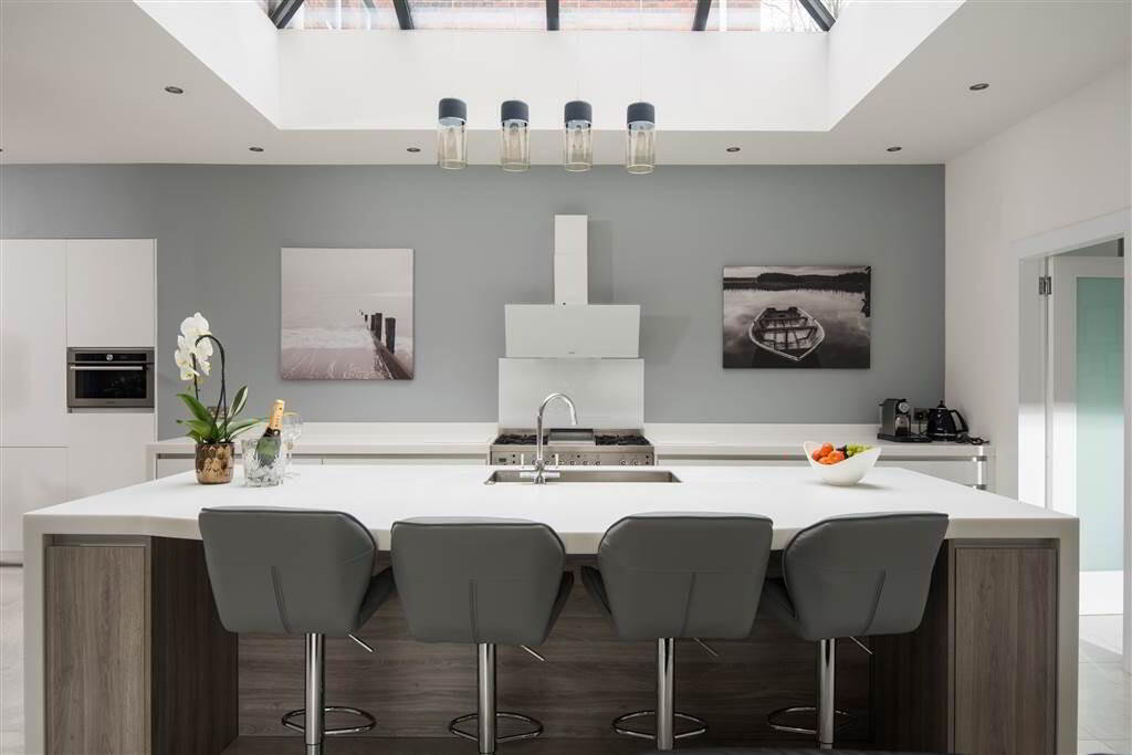 An exceptional L shaped kitchen which contains a range of high and low level white handle-less units, seamless Corian worktops, built in American fridge freezer unit, recess for range with "Elica" extractor fan, integrated microwave/oven. Island with additional cupboards plug tower with blue tooth sound, Blanco 1.5 stainless steel sink unit, mixer tap, built in integrated dishwasher, stainless steel sink drainer, low voltage LED lighting, ceramic tiled floor and atrium roof window, roof light with pendant lighting, sliding door to garden leading to... - UTILITY ROOM: