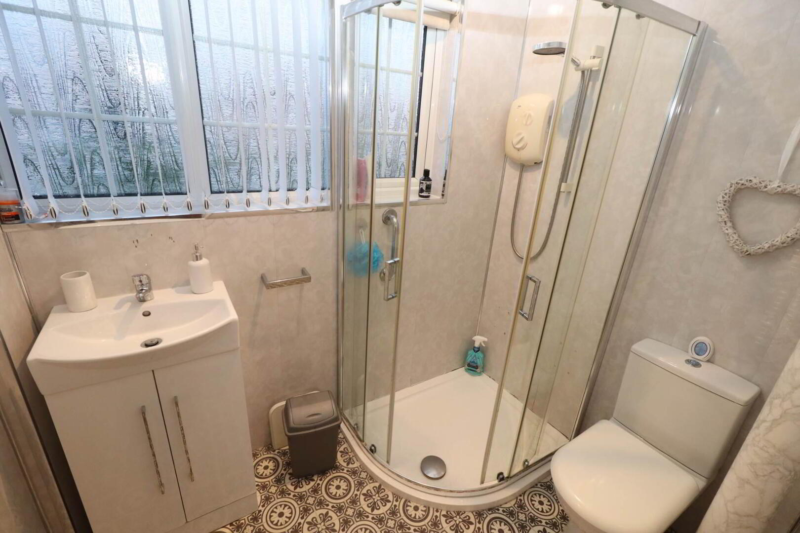 White bathroom suite comprising of shower cubicle, vanity unit wash hand basin, low flush W/C PVC wall panelling ,vinyl flooring.