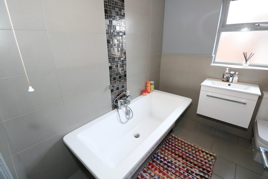 BATHROOM: 8' 0" x 7' 11" (2.44m x 2.17m) Luxurious white family bathroom suite comprising free standing bath with telephone shower, low flush W/C, vanity unit wash hand basin, ceramic floor and wall tiles.