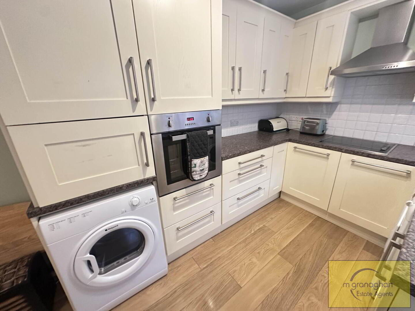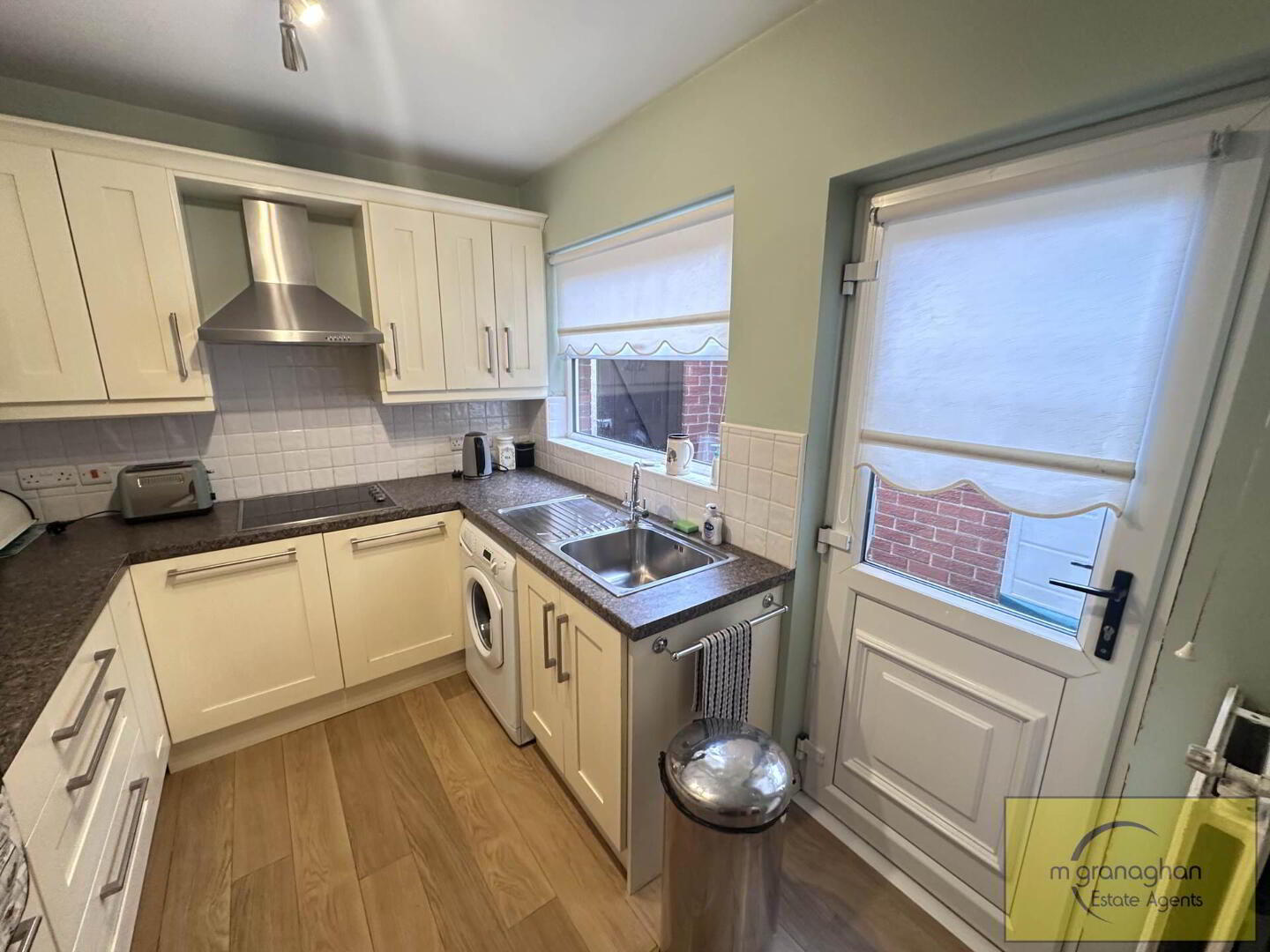 Fitted kitchen with a range of high and low level units, formica work surfaces, stainless steel sink drainer, built in oven, ceramic hob with overhead stainless steel extractor fan.plumbed for washing machine, part tiled walls, laminate flooring, access to rear