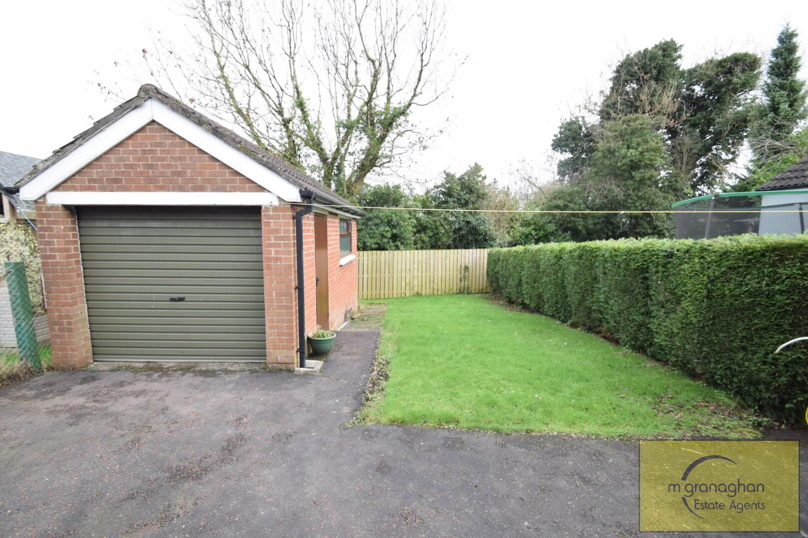 Fully enclosed front garden in lawn, driveway, wrought iron gate