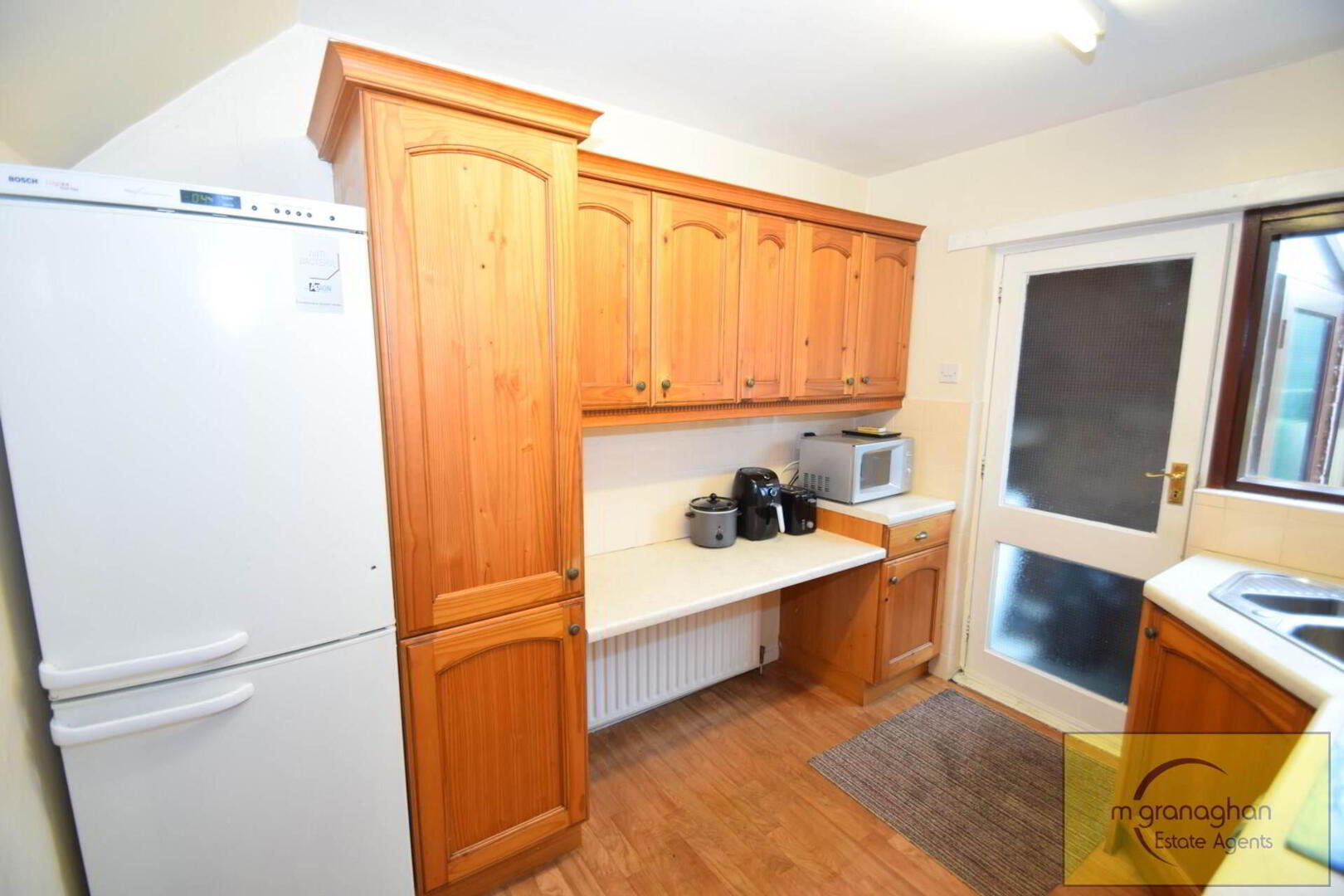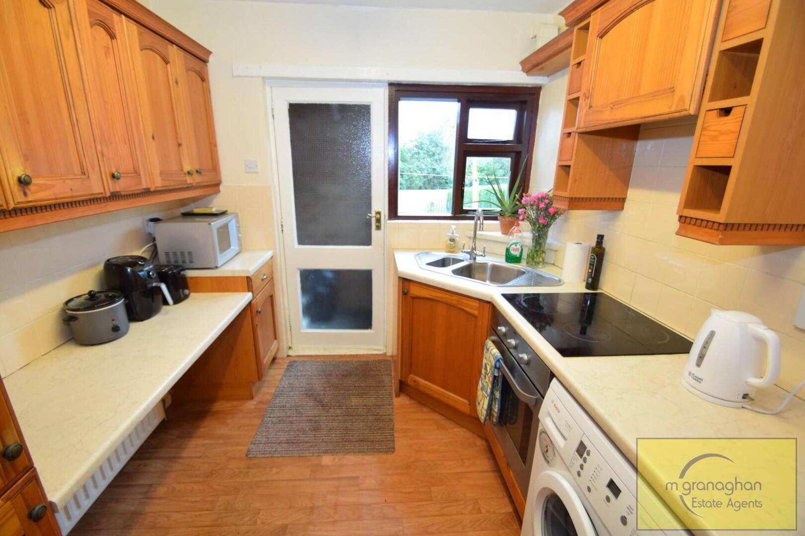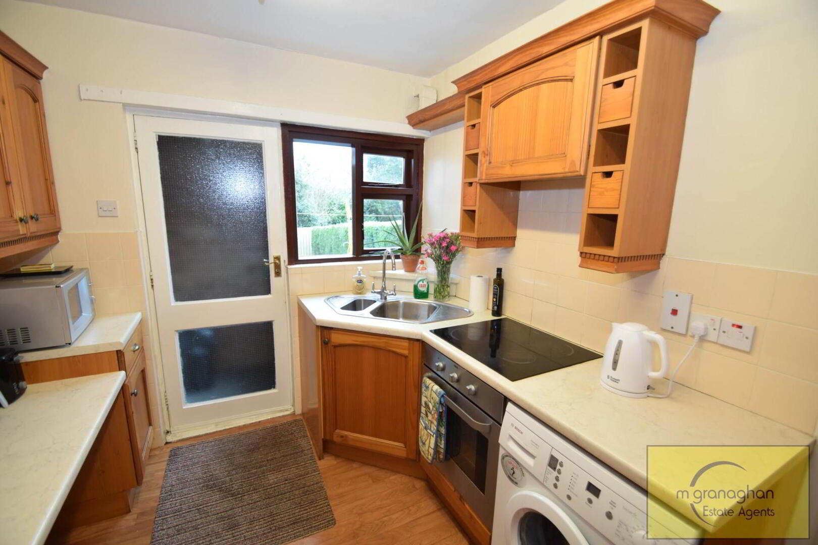 Fully fitted kitchen comprising of high and low level units, formica work surfaces, integrated hob and oven, stainless steel sink drainer, plumbed for washing machine, part tile walls, vinyl flooring