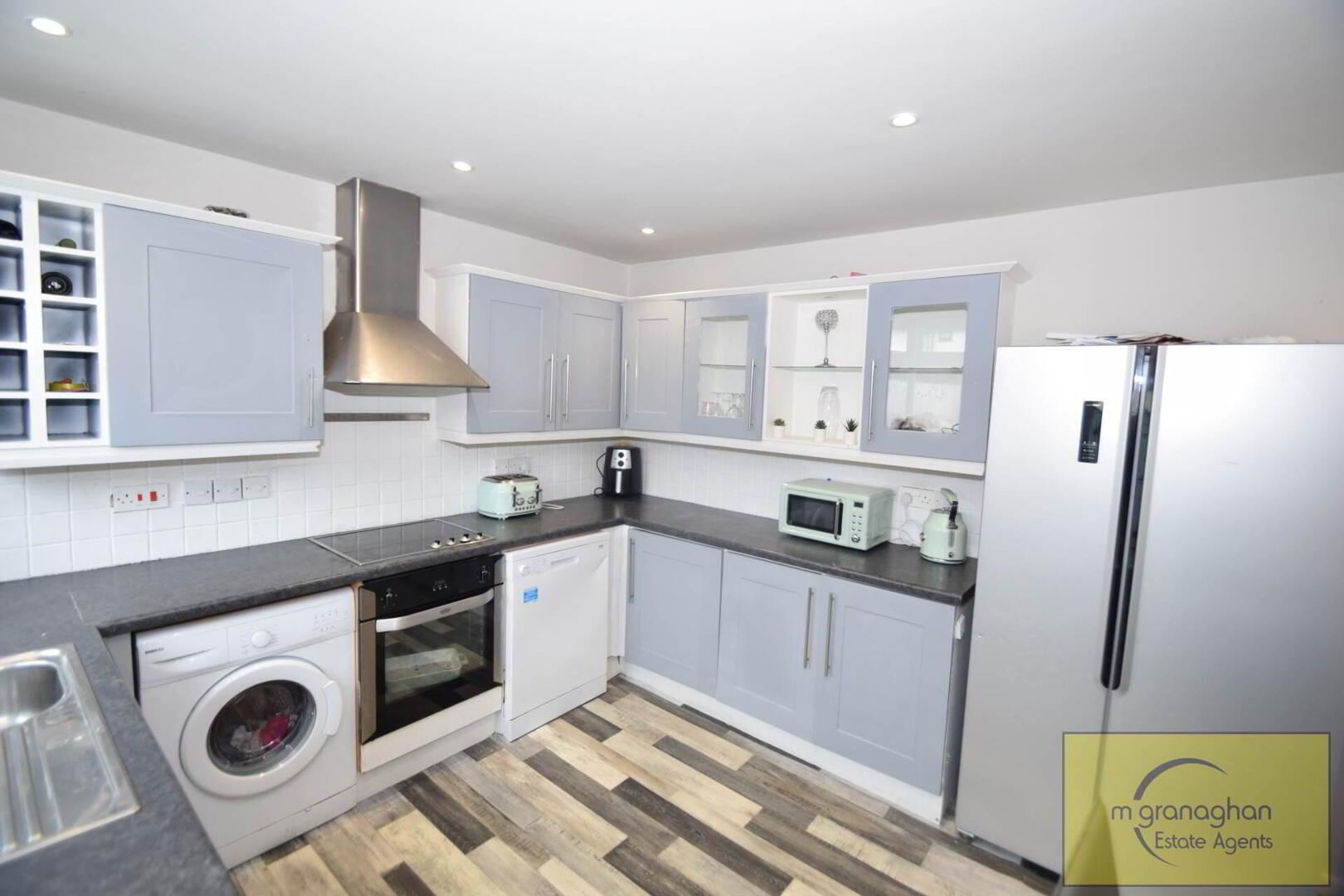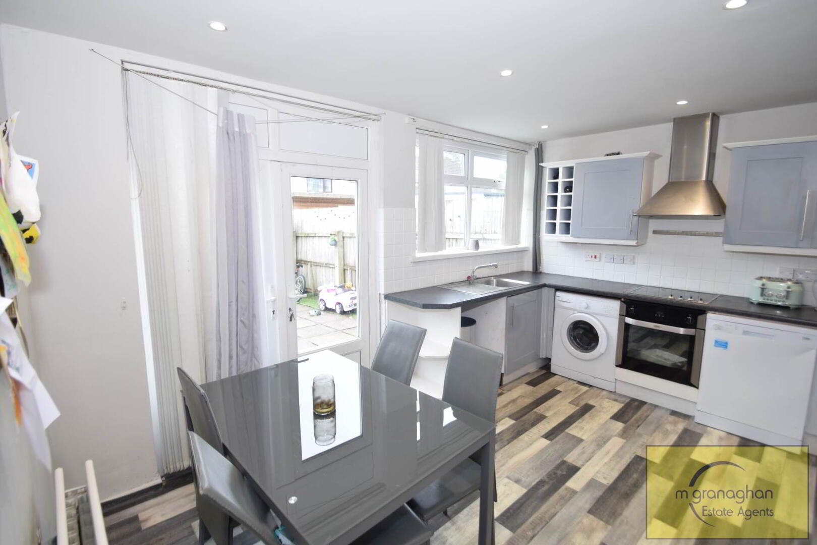 Modern fitted kitchen comprising of a range of high & low level units, formica work surfaces, stainless steel sink drainer, stainless steel extractor fan, integrated hob & oven, plumb for washing machine, part tile walls, vinyl flooring