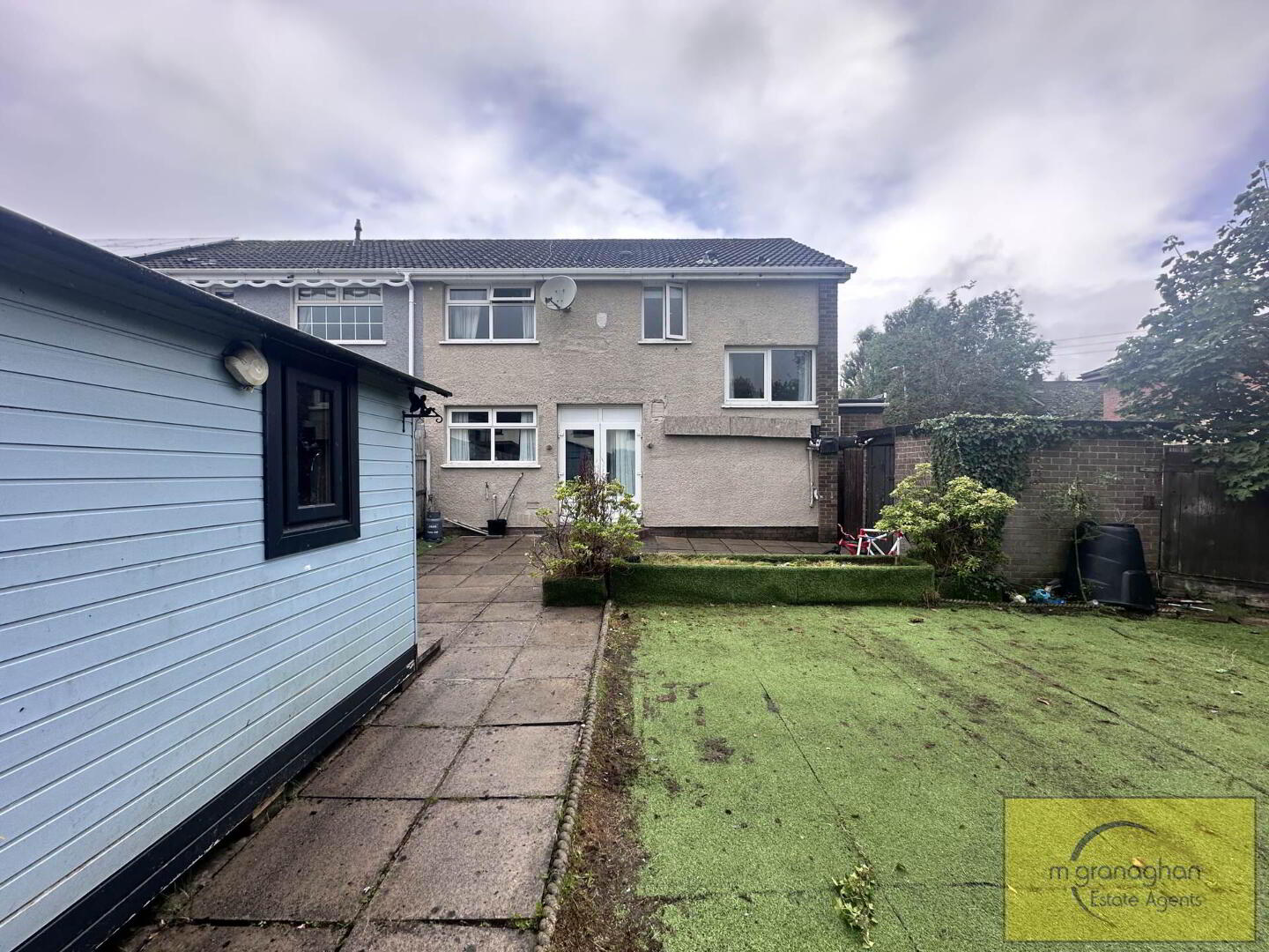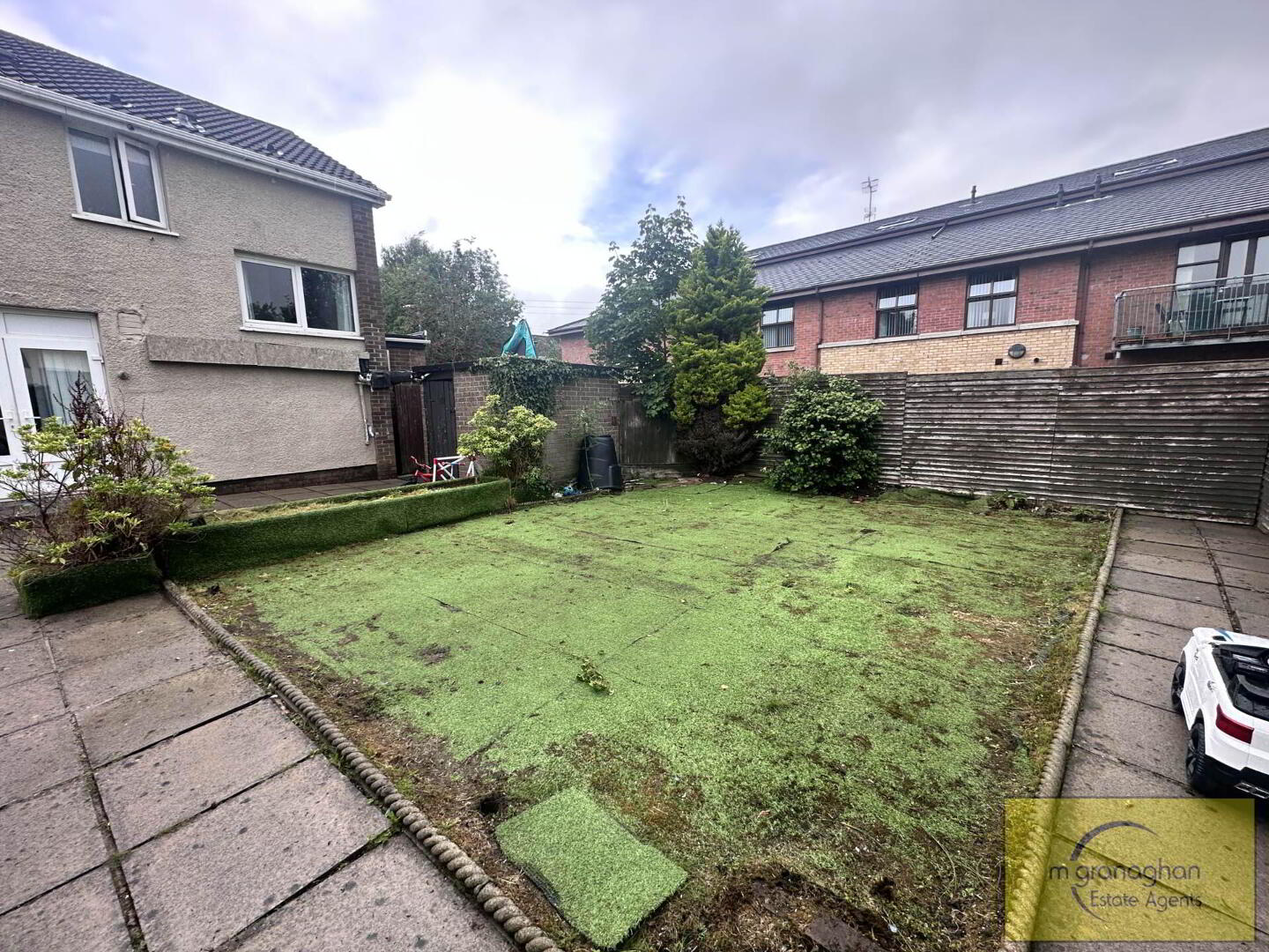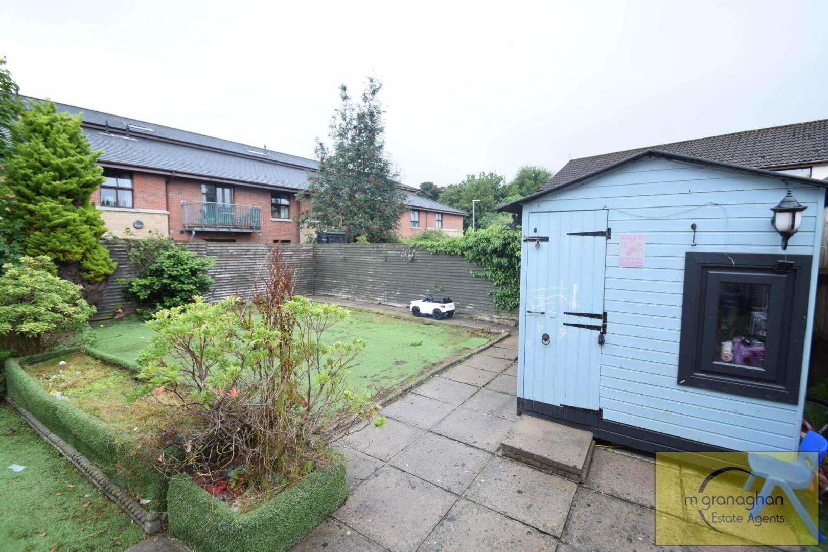 Fully enclosed, easily maintained garden with artificial lawn with patio area and garden shed.