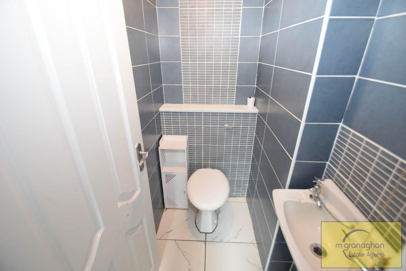 Free standing wash hand basin, low flush W/C, ceramic tiled flooring