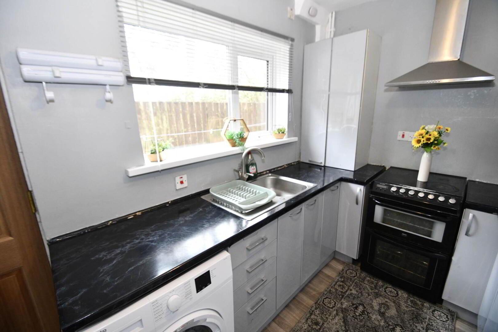 Fitted kitchen with a range of high and low level units, formica work surfaces, stainless steel sink drainer, space for cooker with overhead stainless steel extractor fan, plumbed for washing machine, vinyl flooring, access to rear