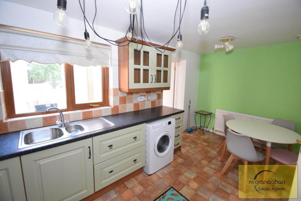 Modern fitted kitchen comprising of high and low level units, Formica work surfaces, stainless steel sink drainer,part tiled walls, plumbed for washing machine