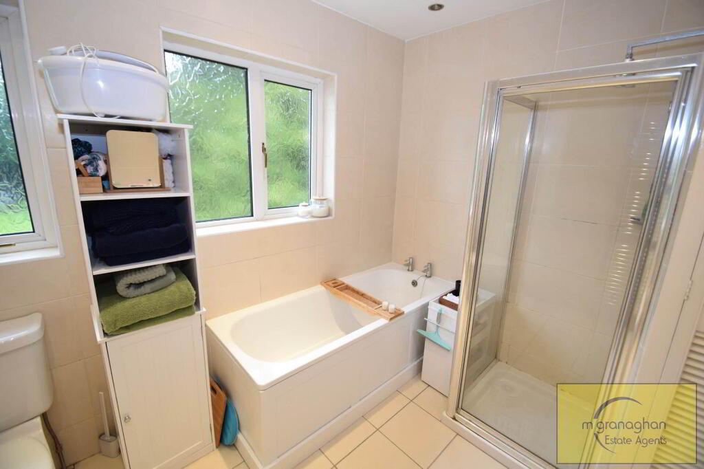 The property boasts four generously sized bedrooms, each of which is beautifully decorated and offers plenty of space for storage. The main family bathroom is also well-appointed, featuring a modern suite and stylish tiling with both panel bath and separate walk in shower cubicle.