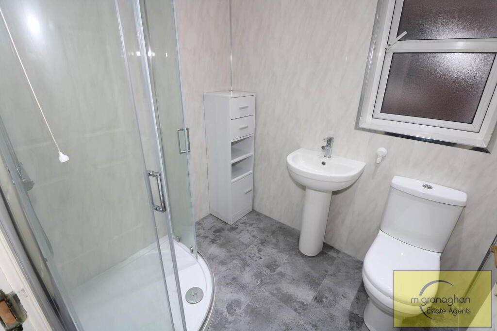 Shower room - 6'9" (2.06m) x 6'6" (1.98m) Shower cubicle, pedestal wash hand basin, low flush W/C, PVC wall paneling